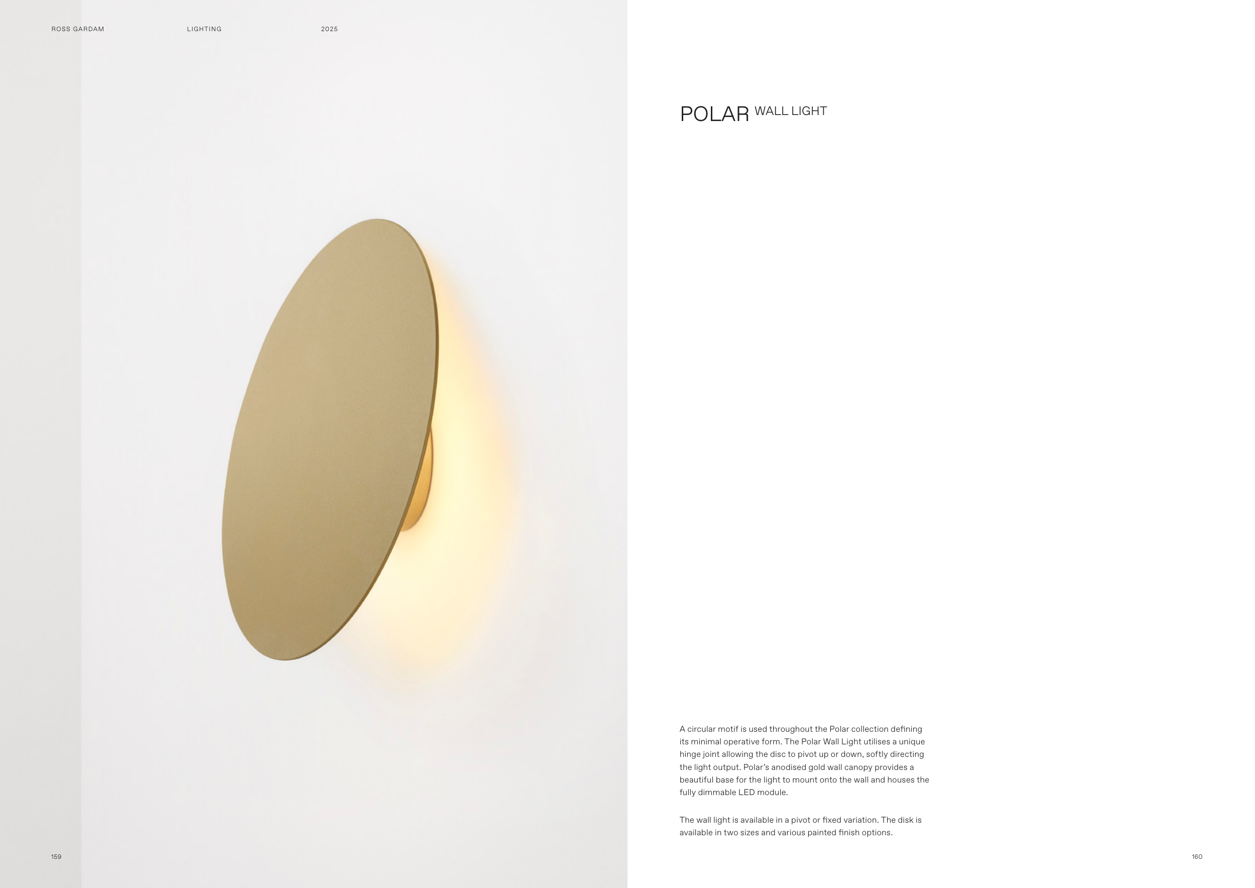 The wall light is available in a pivot or fixed variation. The disk is