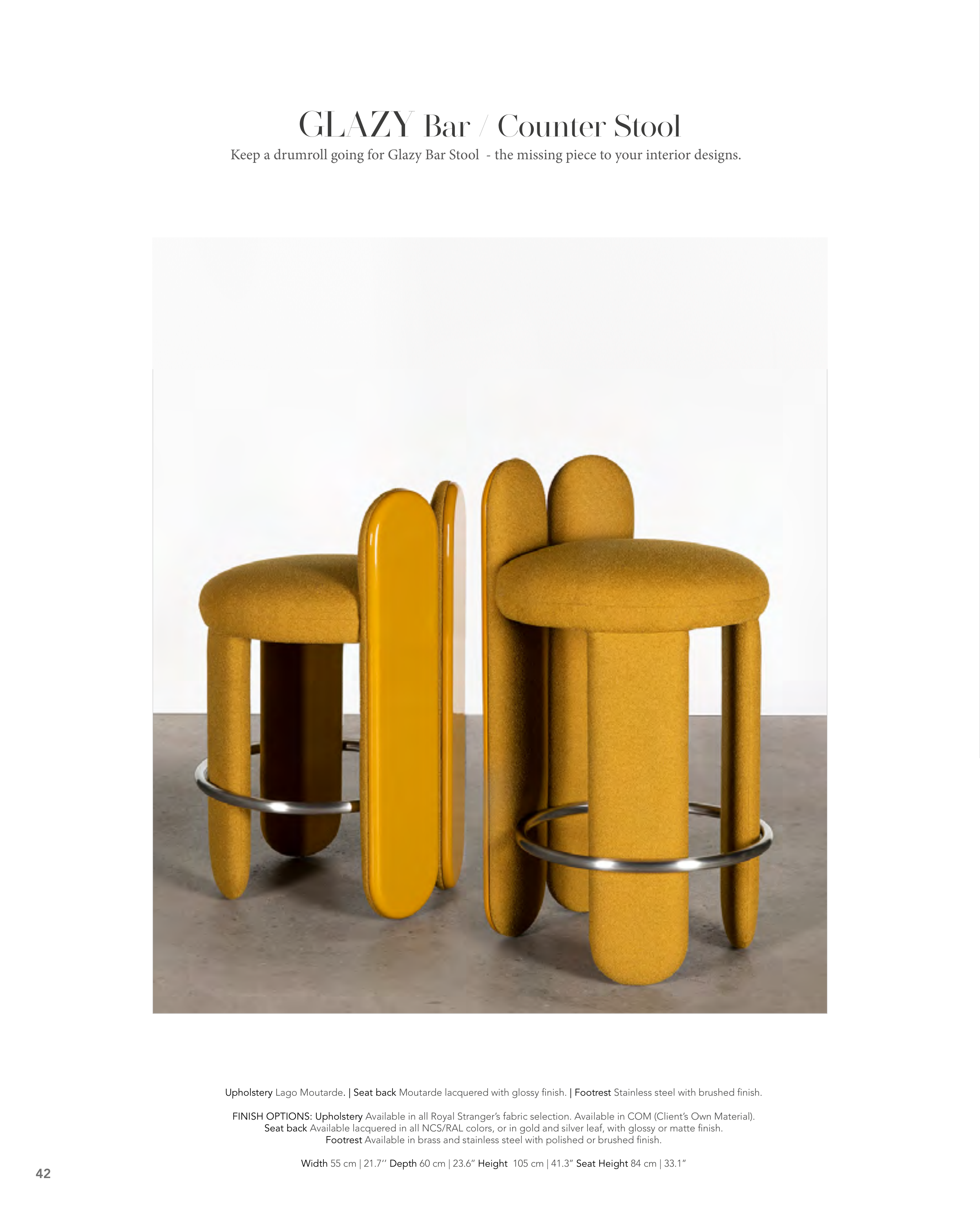 Upholstery Lago Moutarde. | Seat back Moutarde lacquered with glossy finish. | Footrest Stainless steel with brushed finish.
