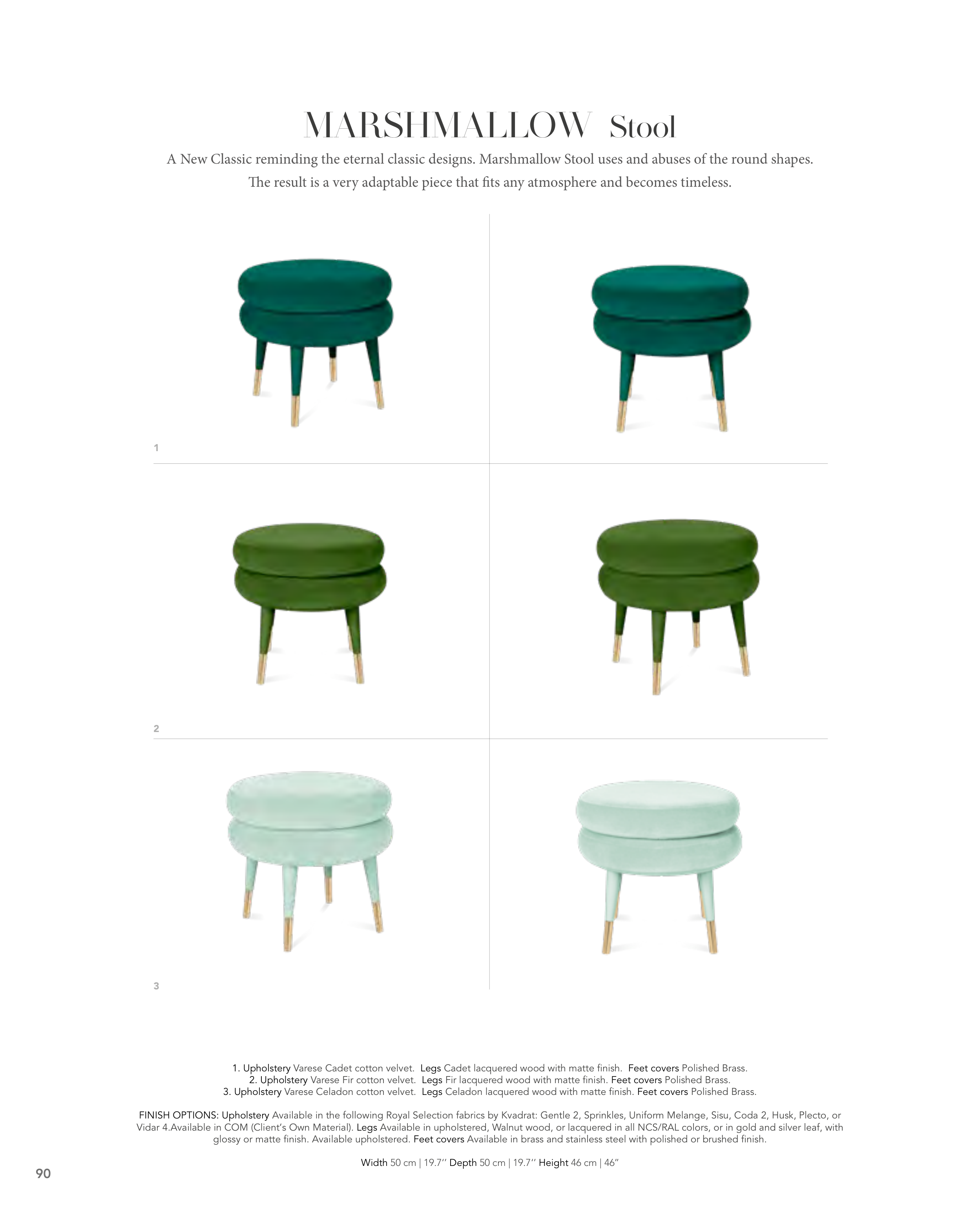 2. Upholstery Varese Fir cotton velvet. Legs Fir lacquered wood with matte finish. Feet covers Polished Brass.