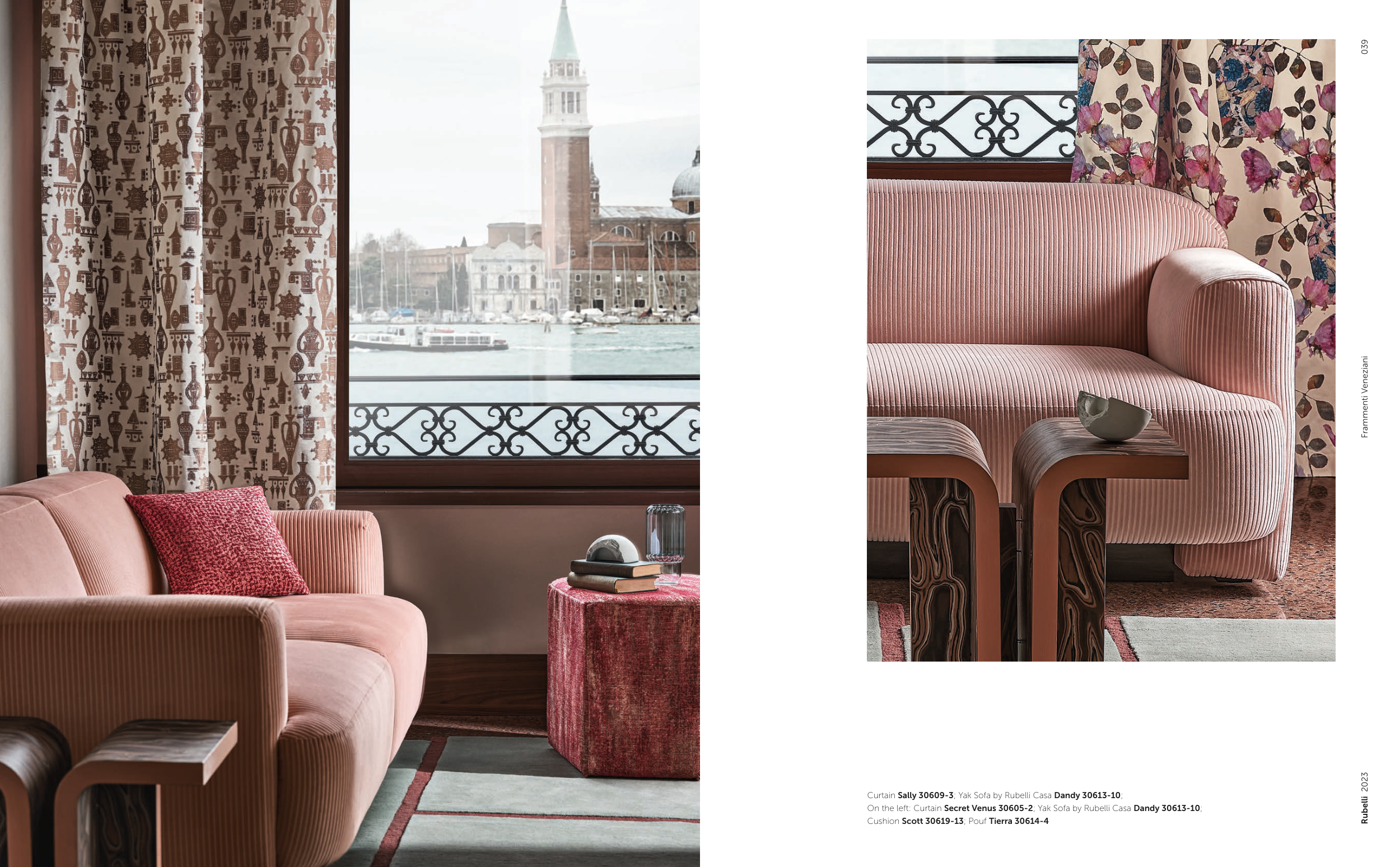 On the left: Curtain Secret Venus 30605-2; Yak Sofa by Rubelli Casa Dandy 30613-10;