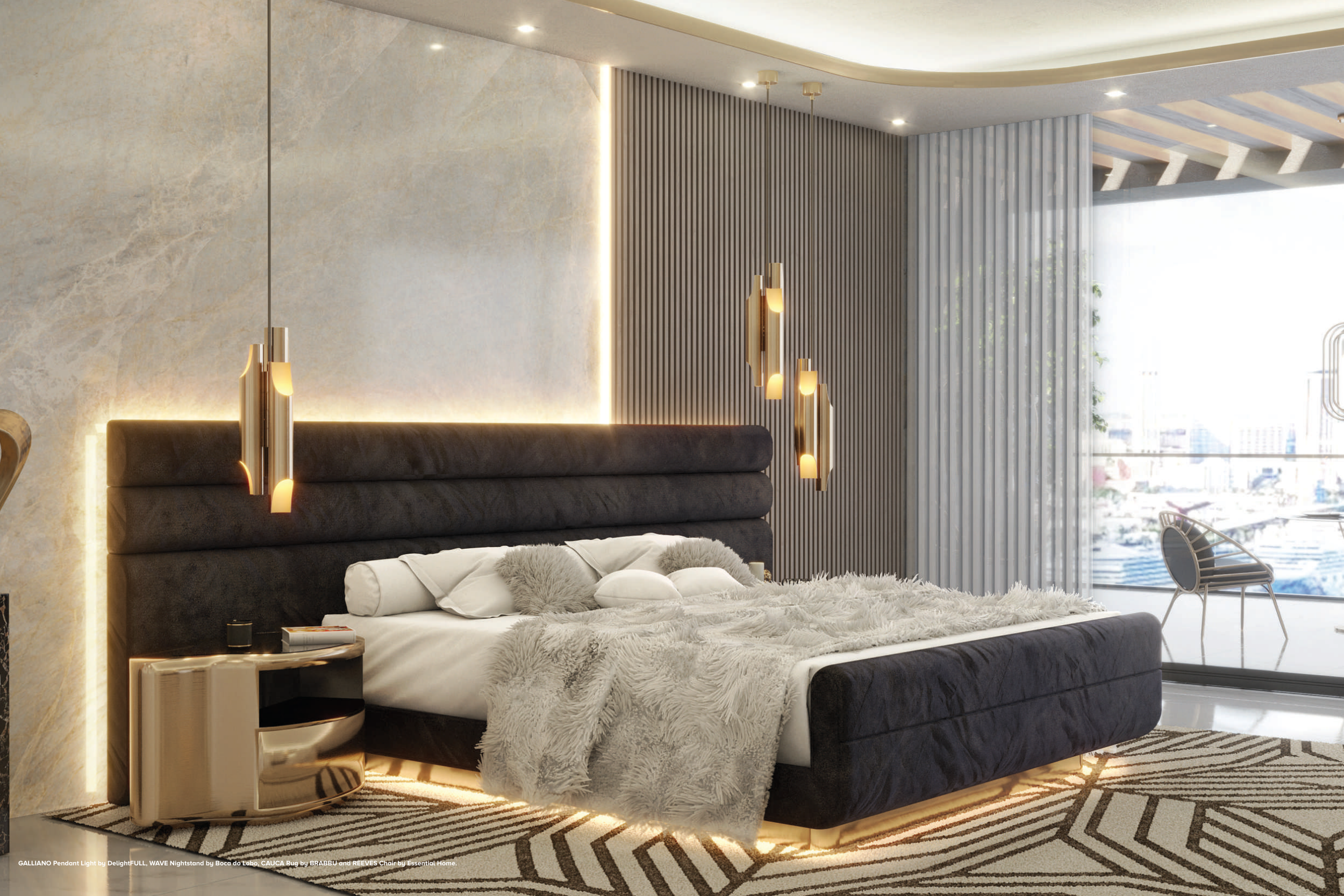 GALLIANO Pendant Light by DelightFULL, WAVE Nightstand by Boca do Lobo, CAUCA Rug by BRABBU and REEVES Chair by Essential Home.