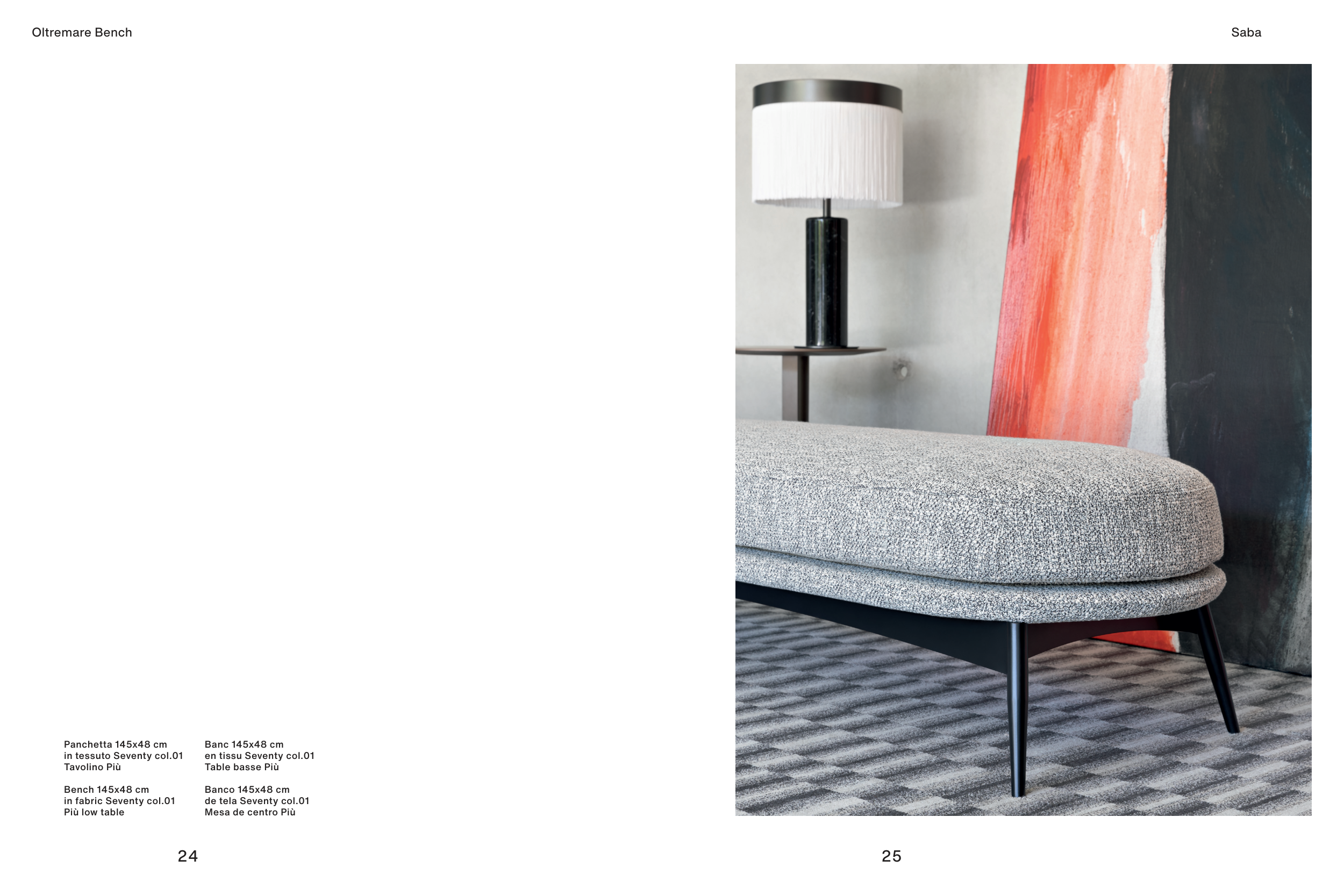 Oltremare Bench Panchetta 145x48 cm in tessuto Seventy col.01 Tavolino Più Bench 145x48 cm in fabric Seventy col.01 Più low table Banc 145x48 cm en tissu Seventy col.01 Table basse Più Banco 145x48 cm de tela Seventy col.01 Mesa de centro Più Saba 24 25