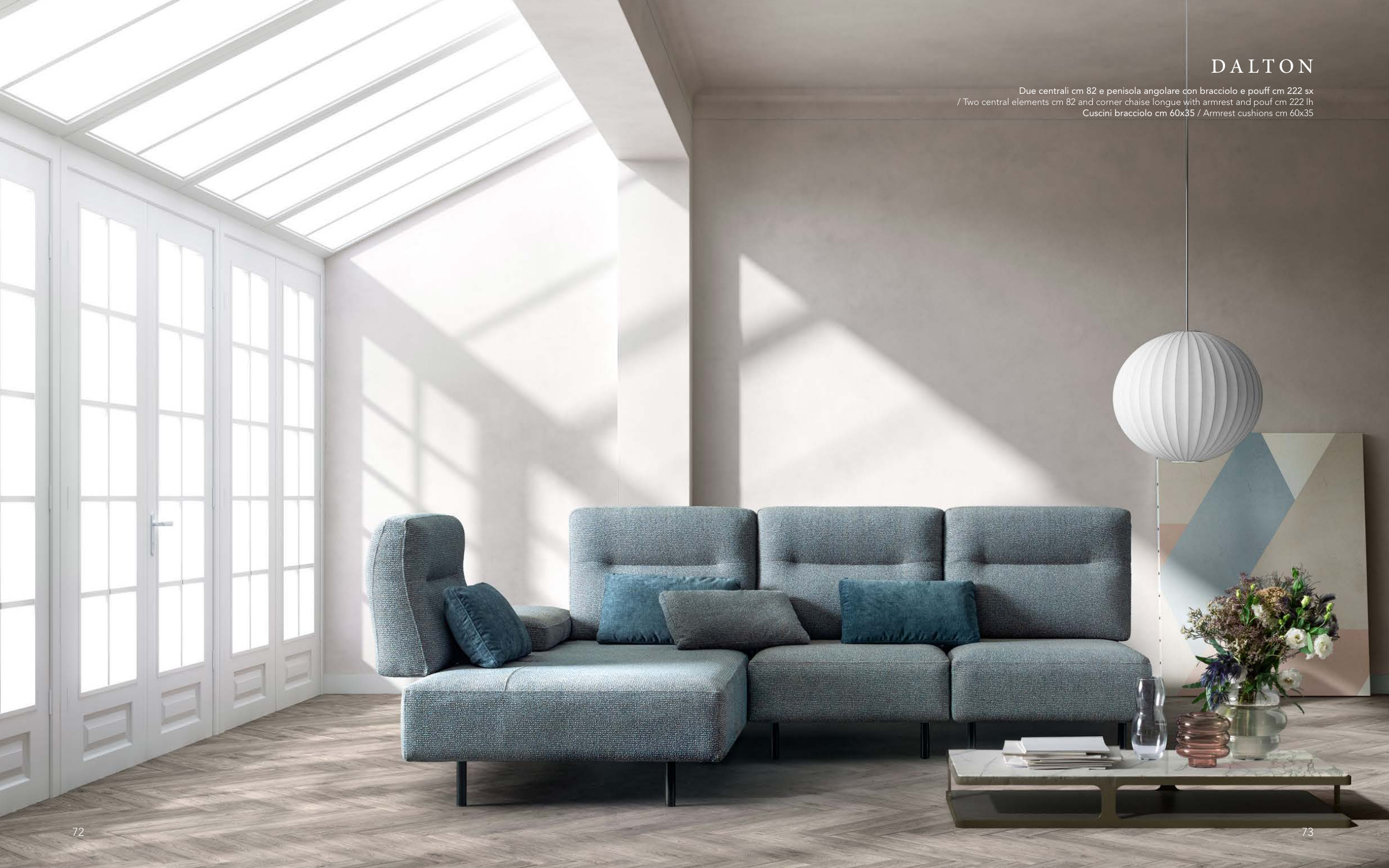 / Two central elements cm 82 and corner chaise longue with armrest and pouf cm 222 lh