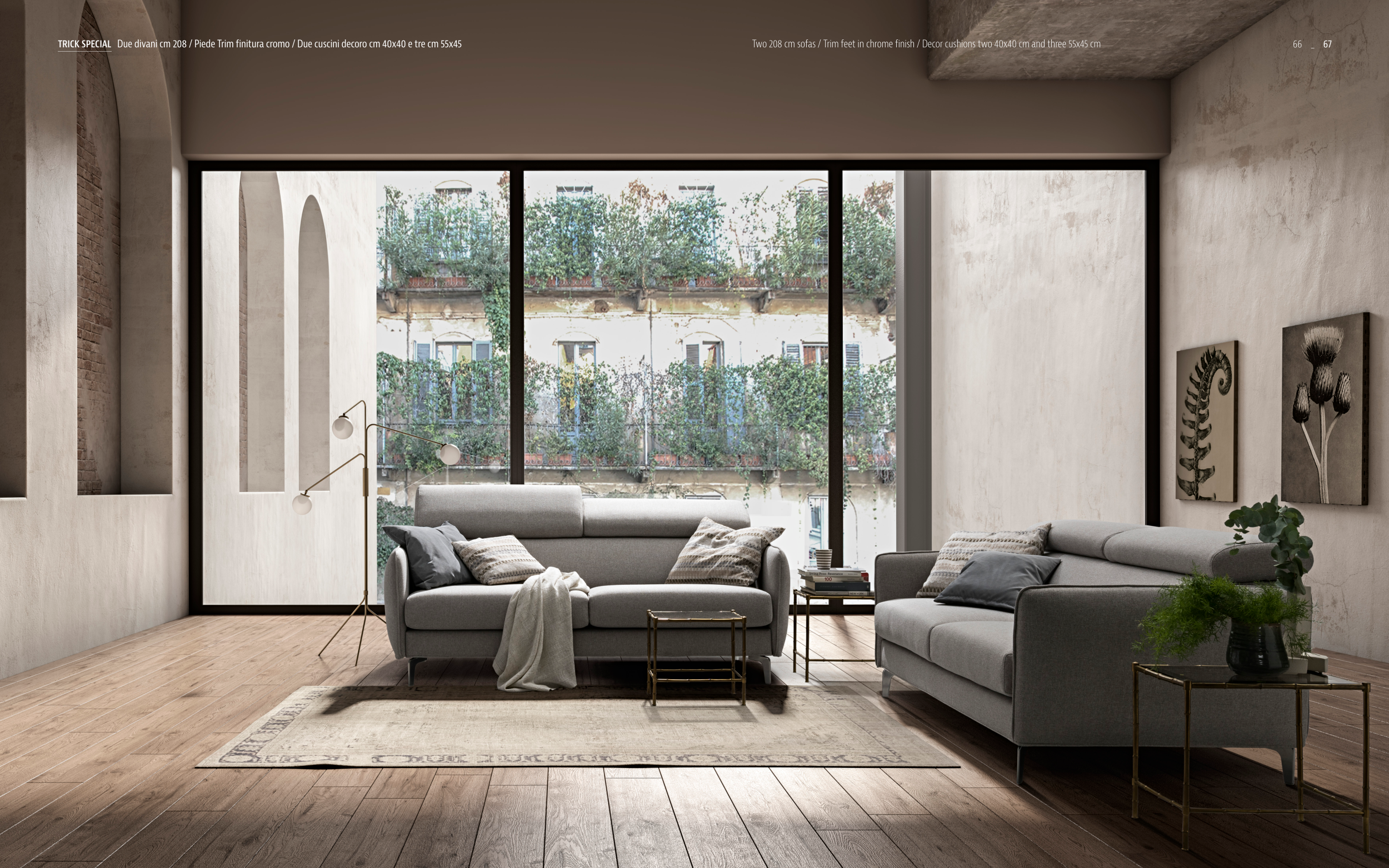 TRICK SPECIAL Due divani cm 208 / Piede Trim finitura cromo / Due cuscini decoro cm 40x40 e tre cm 55x45