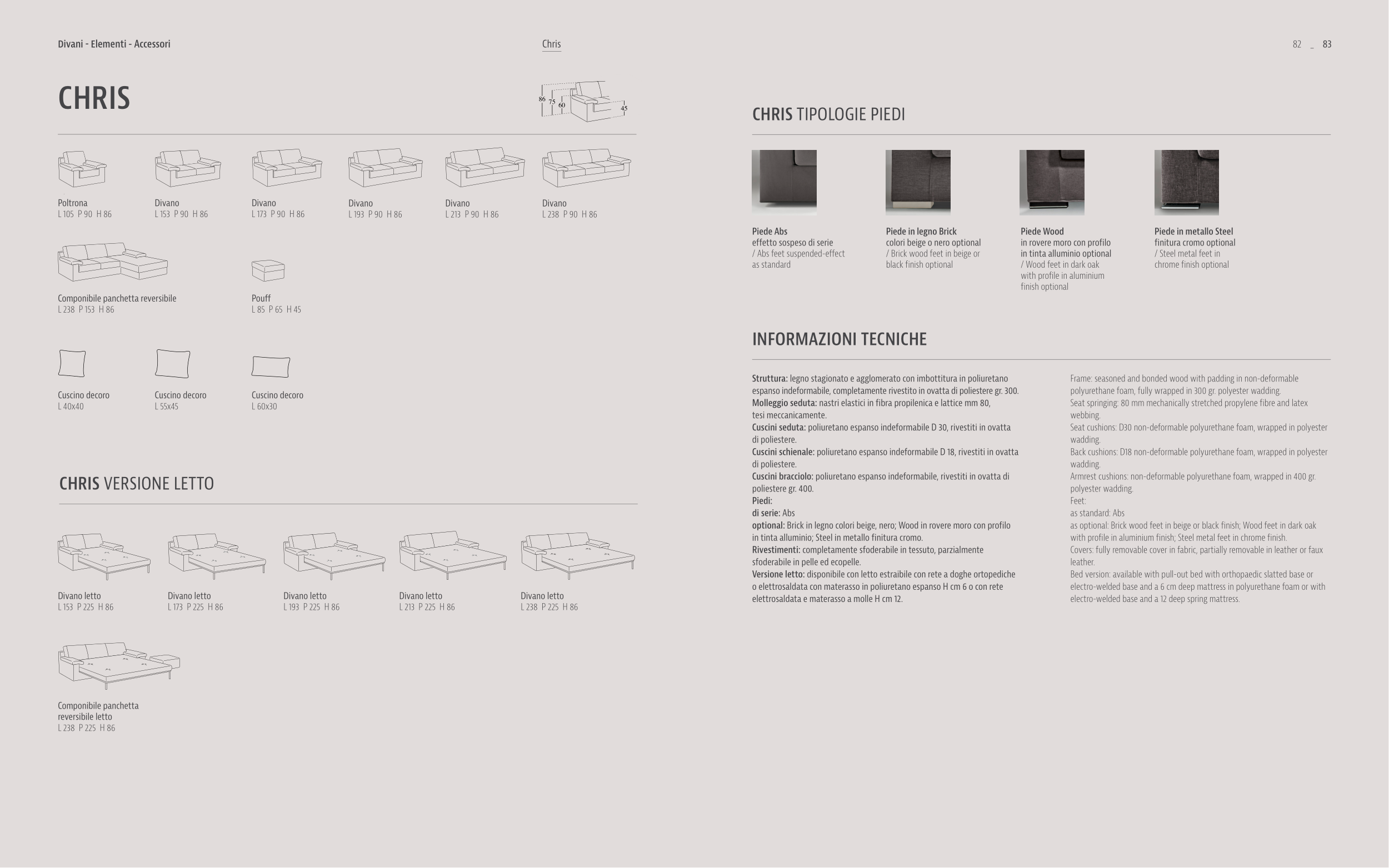 Covers: fully removable cover in fabric, partially removable in leather or faux