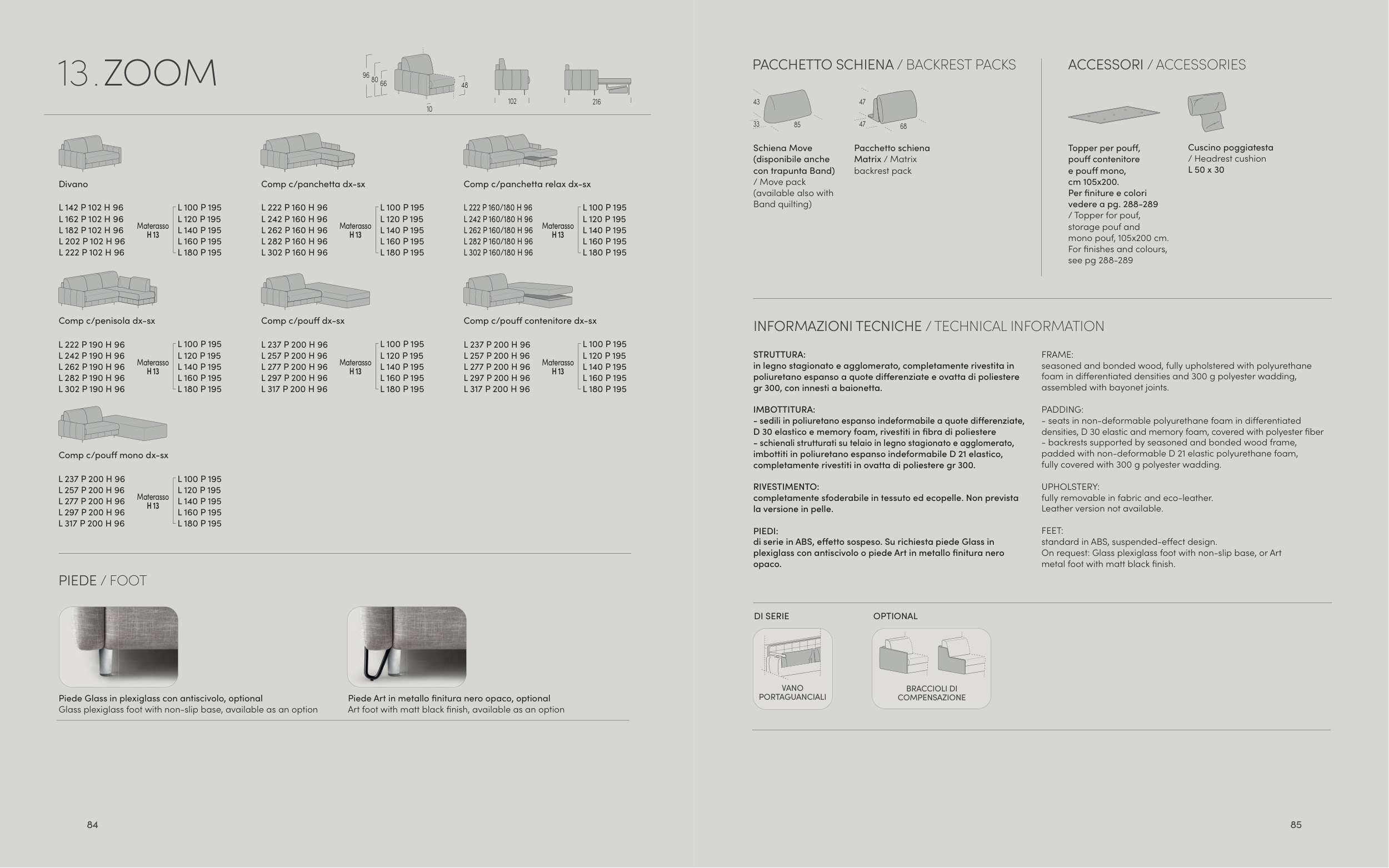 - schienali strutturati su telaio in legno stagionato e agglomerato,