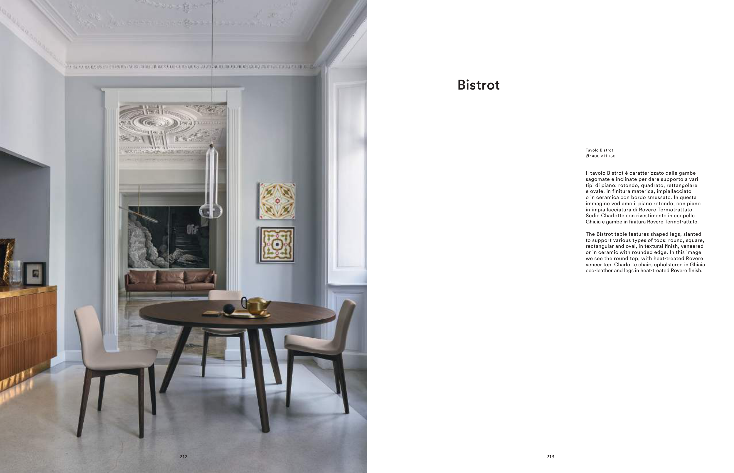 veneer top. Charlotte chairs upholstered in Ghiaia
