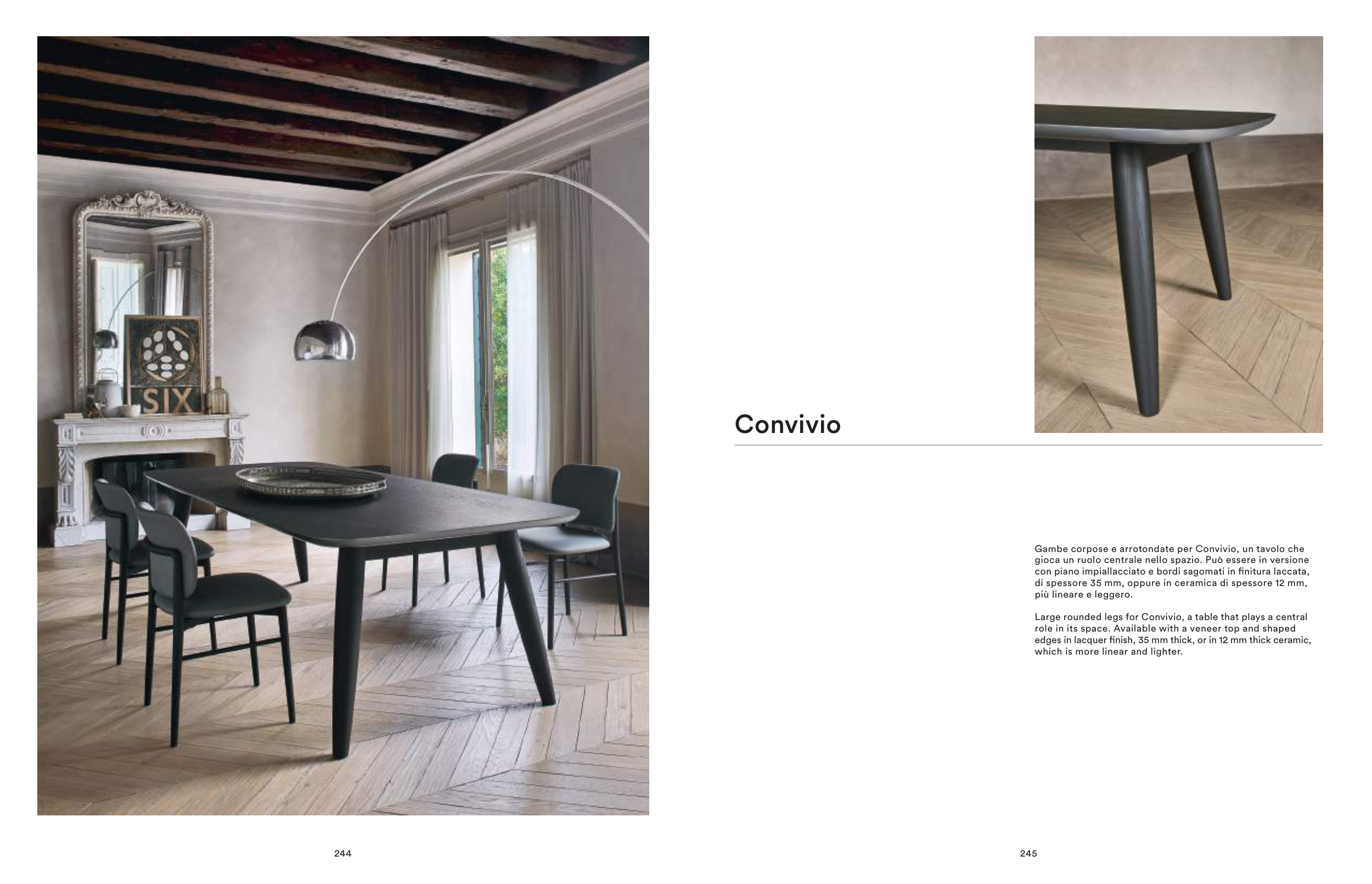 Large rounded legs for Convivio, a table that plays a central