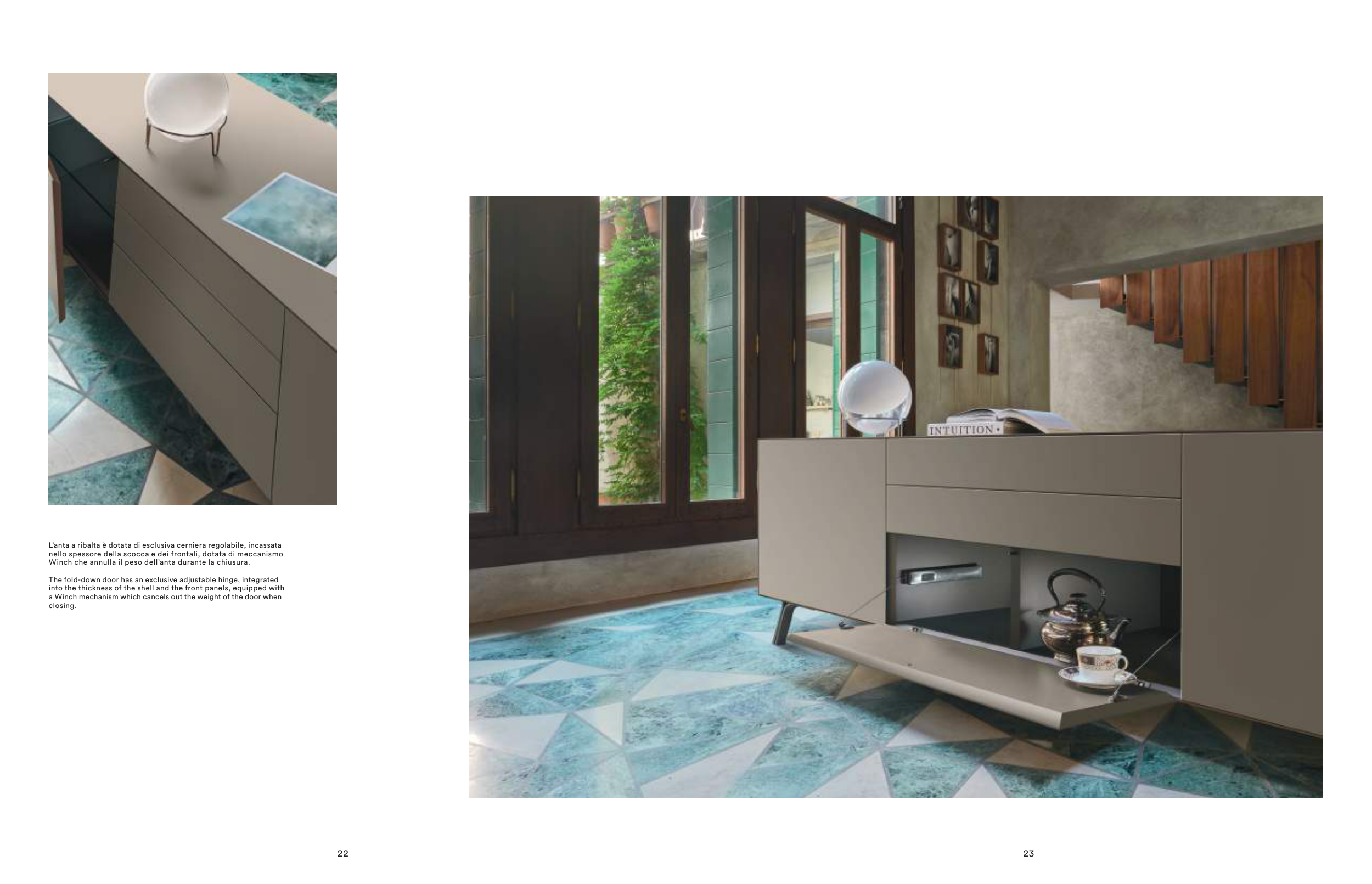 L’anta a ribalta è dotata di esclusiva cerniera regolabile, incassata