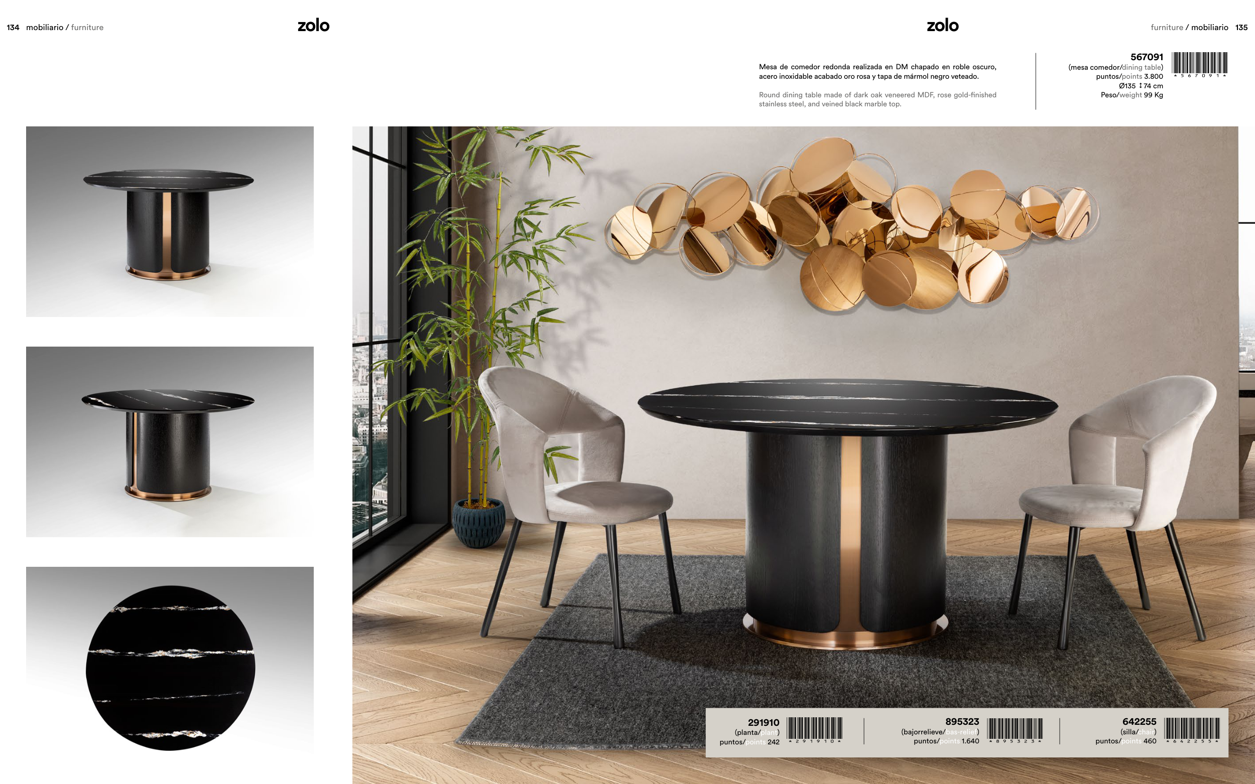 Round dining table made of dark oak veneered MDF, rose gold-finished