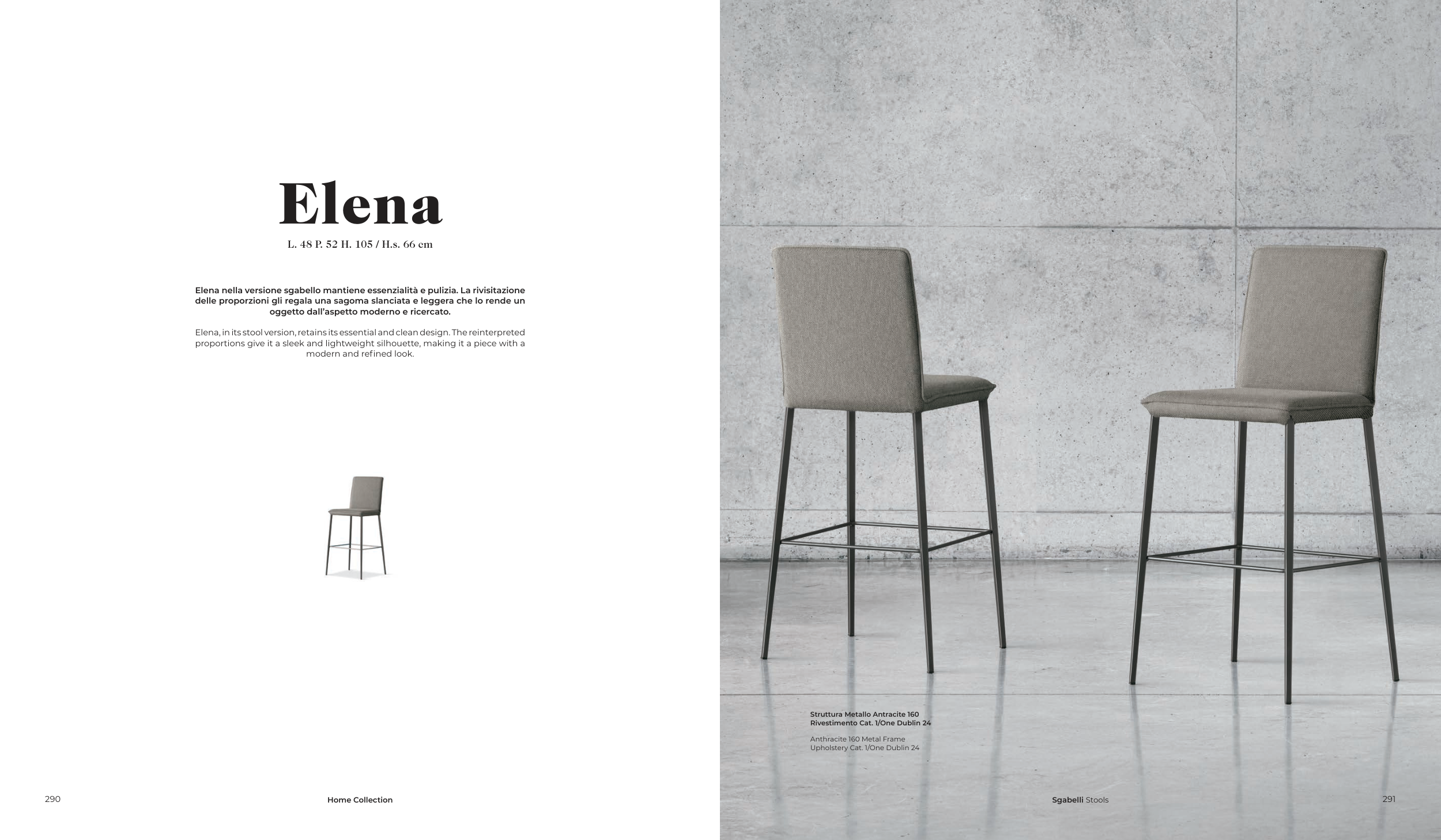 Elena nella versione sgabello mantiene essenzialità e pulizia. La rivisitazione