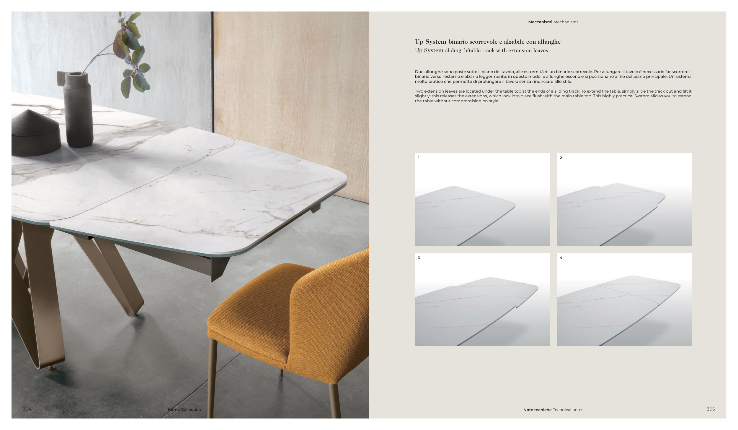 Due allunghe sono poste sotto il piano del tavolo, alle estremità di un binario scorrevole. Per allungare il tavolo è necessario far scorrere il