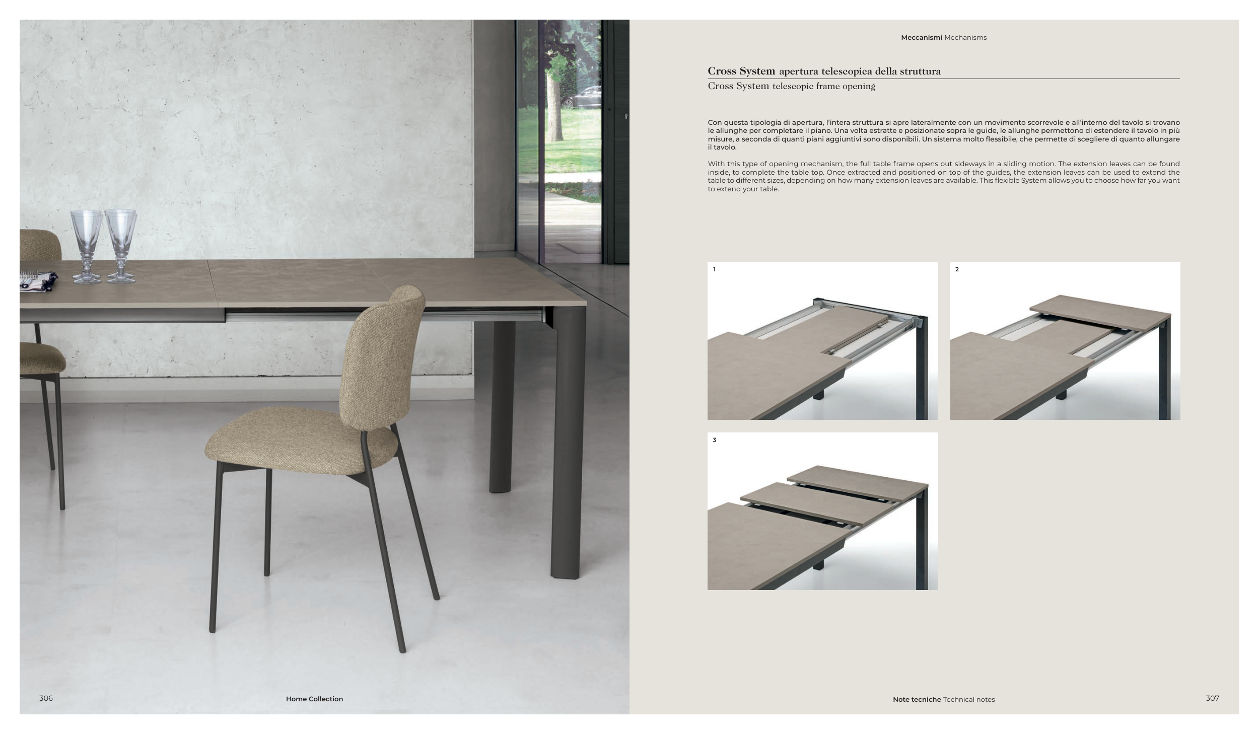 Con questa tipologia di apertura, l’intera struttura si apre lateralmente con un movimento scorrevole e all’interno del tavolo si trovano