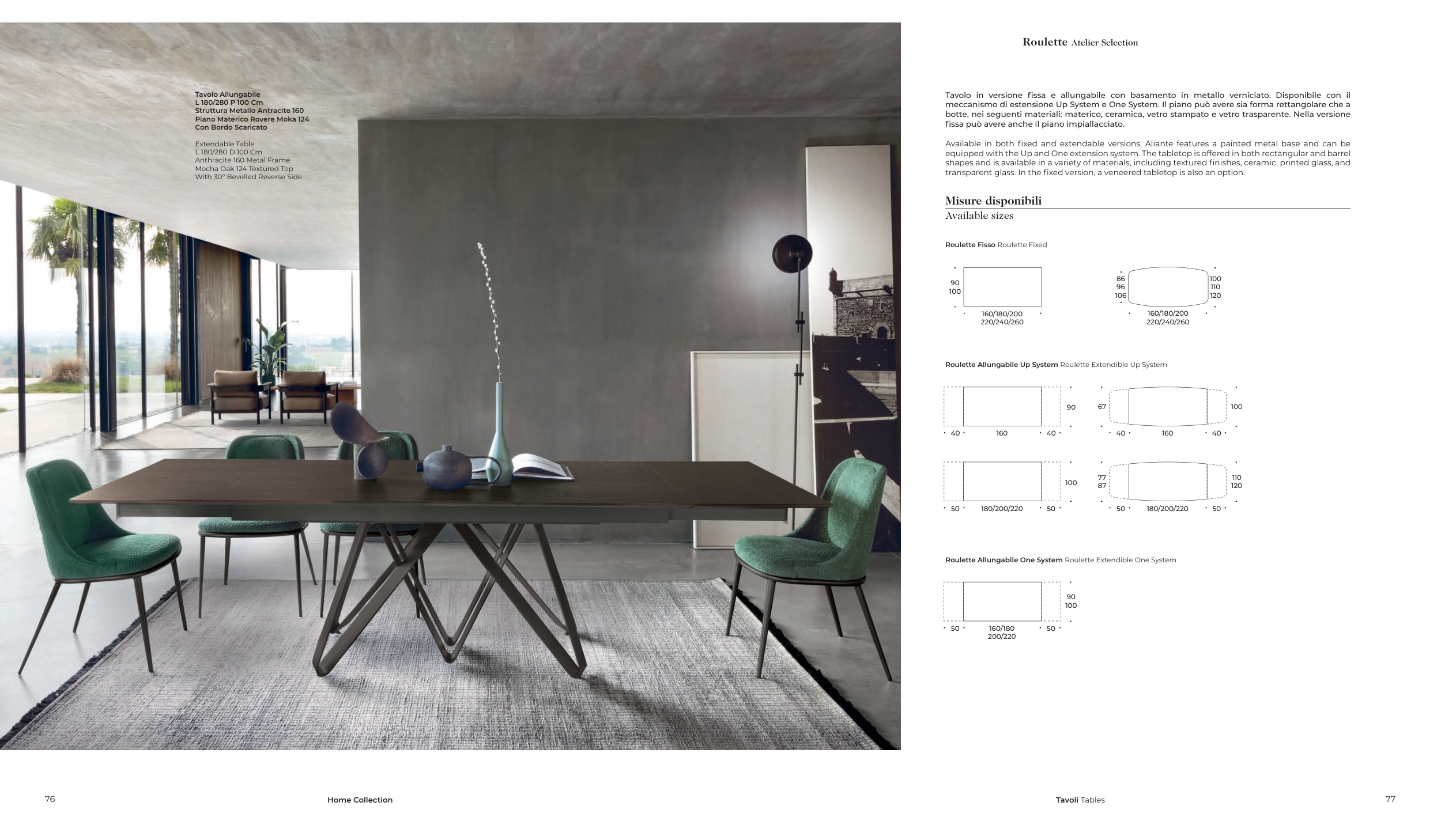 equipped with the Up and One extension system. The tabletop is offered in both rectangular and barrel