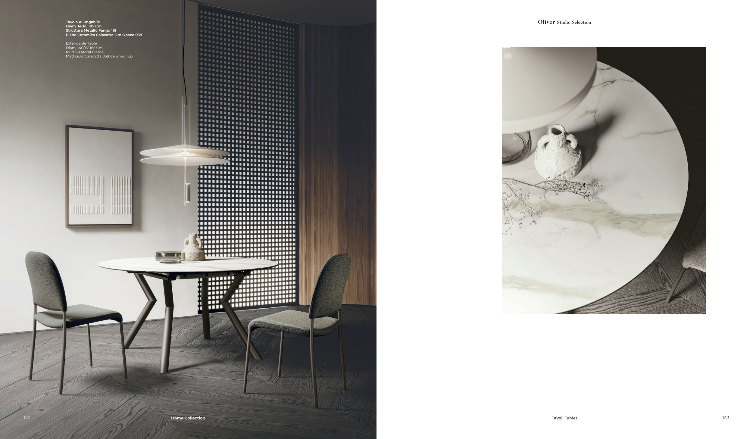 Tavolo Allungabile Diam. 140/L 185 Cm Struttura Metallo Fango 161 Piano Ceramica Calacatta Oro Opaco 038 Extendable Table Diam. 140/W 185 Cm Mud 161 Metal Frame Matt Gold Calacatta 038 Ceramic Top Tavoli Tables 143 Home Collection 142 Oliver Studio Selection