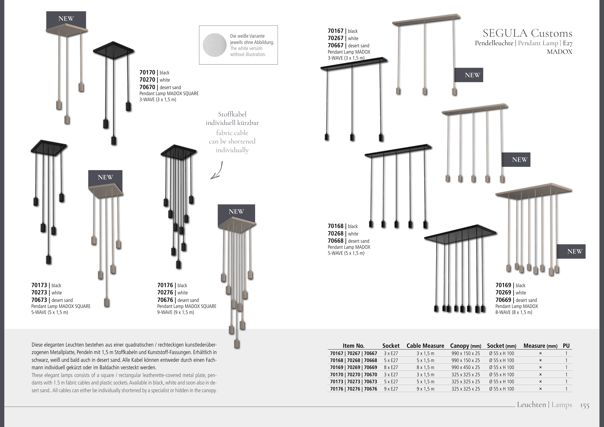zogenen Metallplatte, Pendeln mit 1,5 m Stoffkabeln und Kunststoff-Fassungen. Erhältlich in