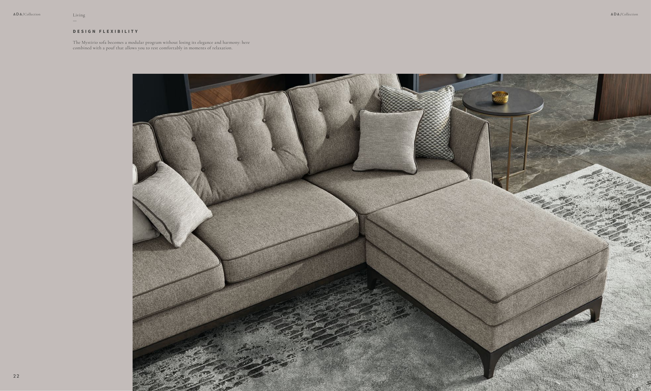 Living — D E S I G N F L E X I B I L I T Y The Mystirio sofa becomes a modular program without losing its elegance and harmony: here combined with a pouf that allows you to rest comfortably in moments of relaxation. 22 ADA/Collection 23 ADA/Collection