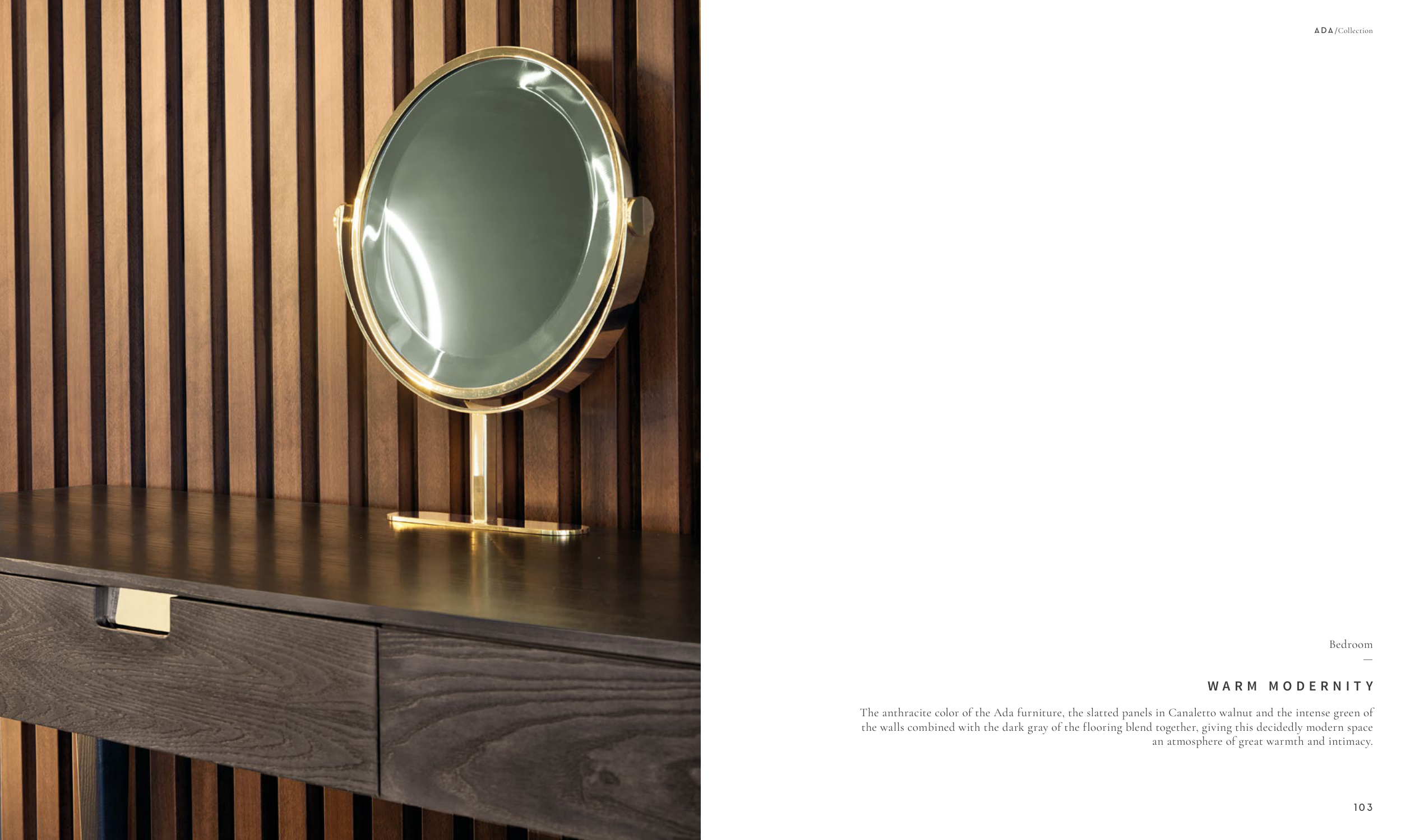 The anthracite color of the Ada furniture, the slatted panels in Canaletto walnut and the intense green of