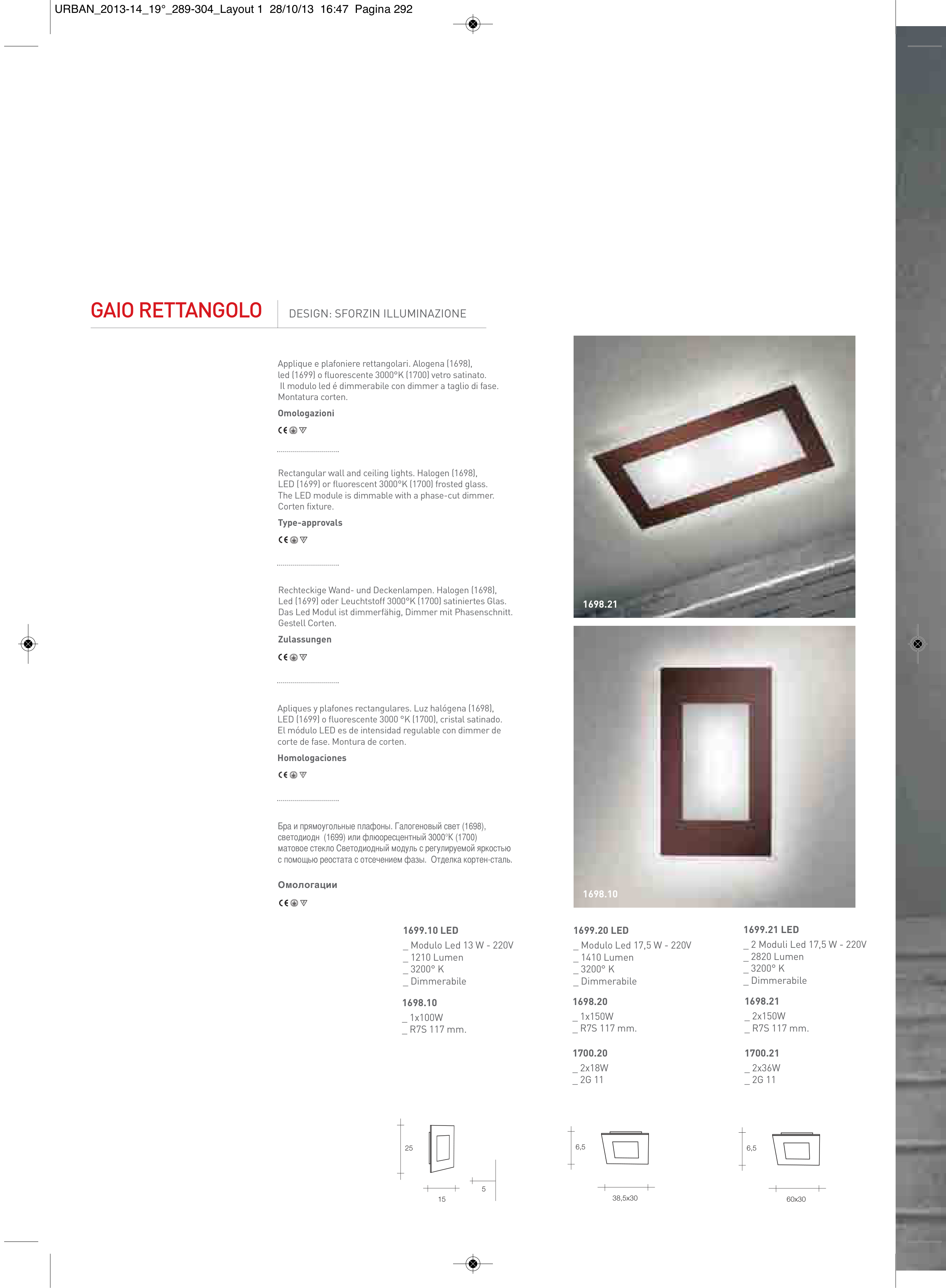 led (1699) o fluorescente 3000°K (1700) vetro satinato.