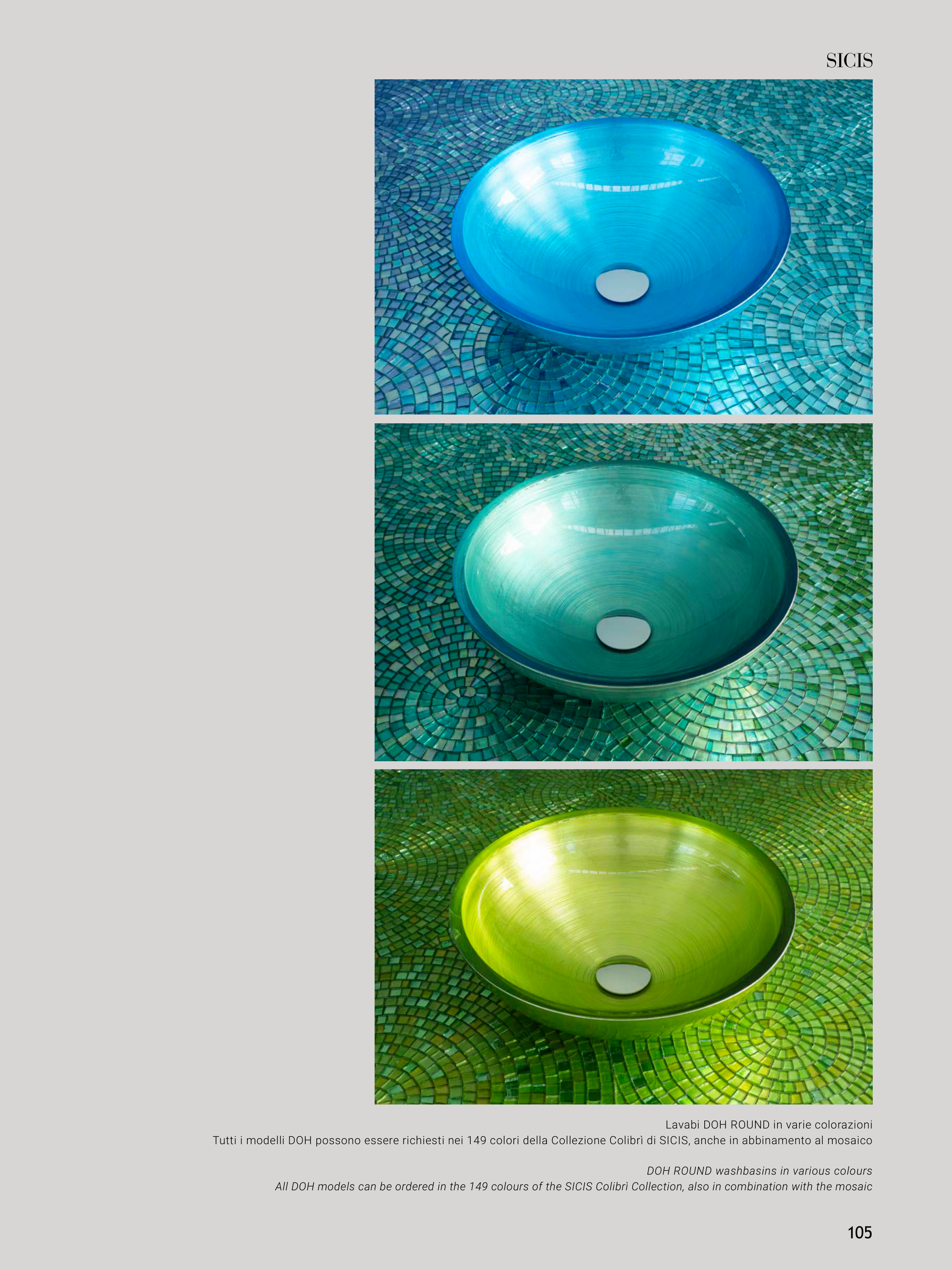 Tutti i modelli DOH possono essere richiesti nei 149 colori della Collezione Colibrì di SICIS, anche in abbinamento al mosaico
