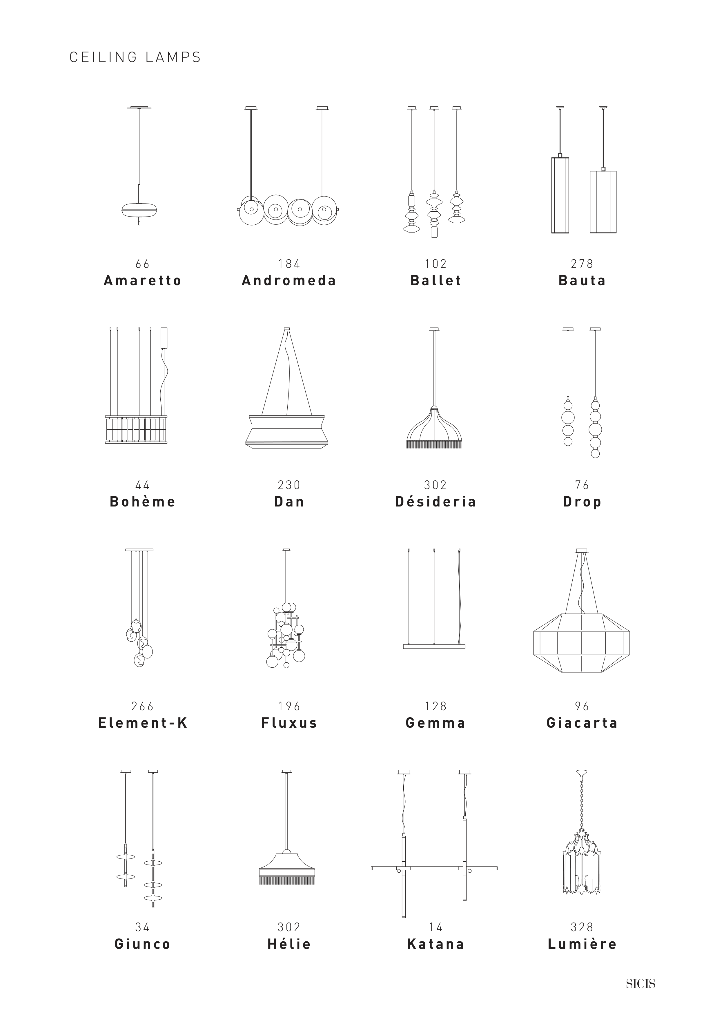 6 6 A m a re t to 2 6 6 Ele m e n t - K 4 4 B o h è m e 3 0 2 H é l i e 1 0 2 B a l le t 1 2 8 G e m m a 3 0 2 D é s i d e r i a 3 2 8 L um i è re 1 8 4 And rom e d a 1 9 6 F l uxus 2 3 0 Da n 1 4 Ka ta na 2 7 8 B a uta 9 6 G i a ca r ta 7 6 D ro p C EIL IN G L A M PS 3 4 Giu n co
