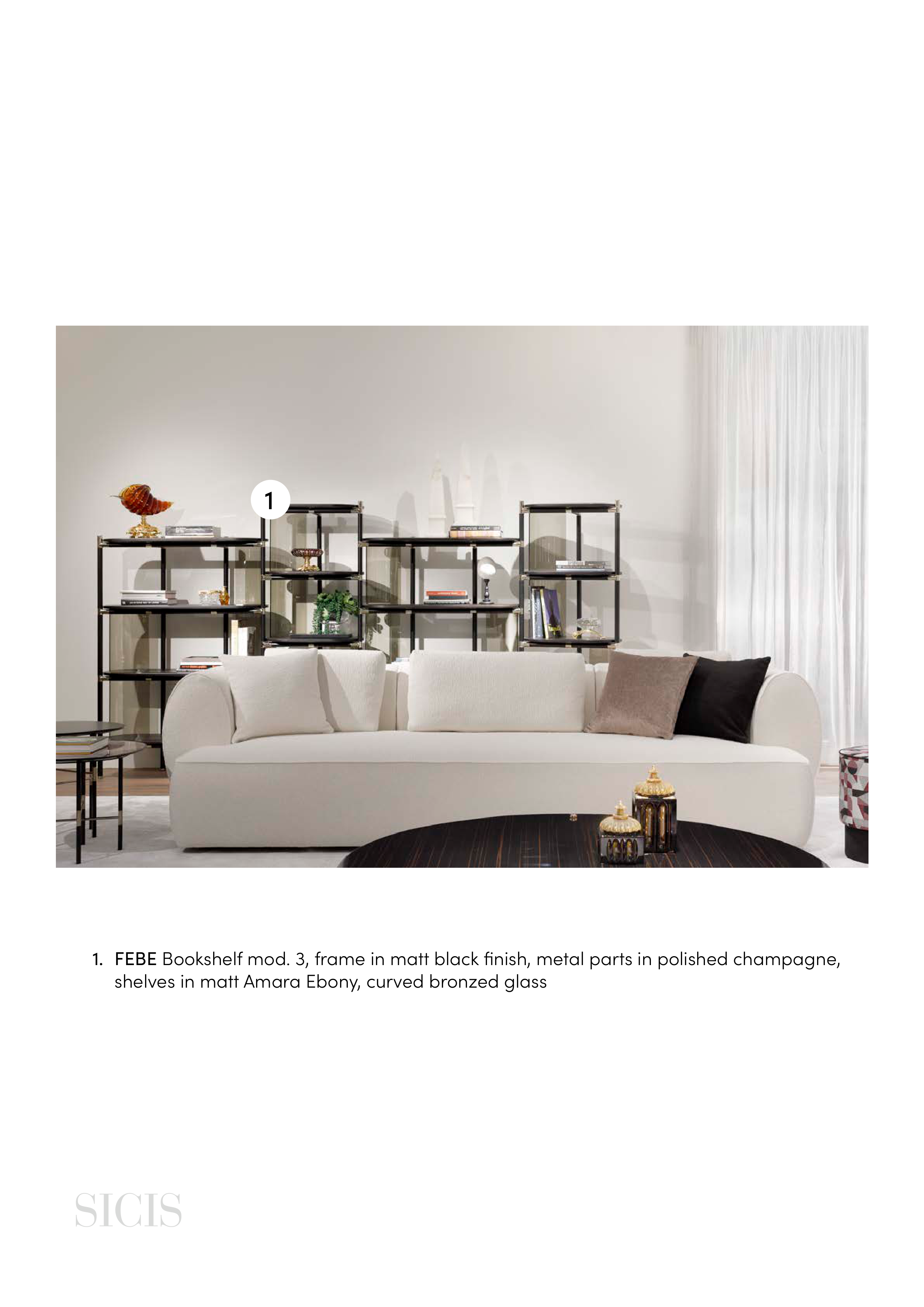 1. FEBE Bookshelf mod. 3, frame in matt black finish, metal parts in polished champagne,