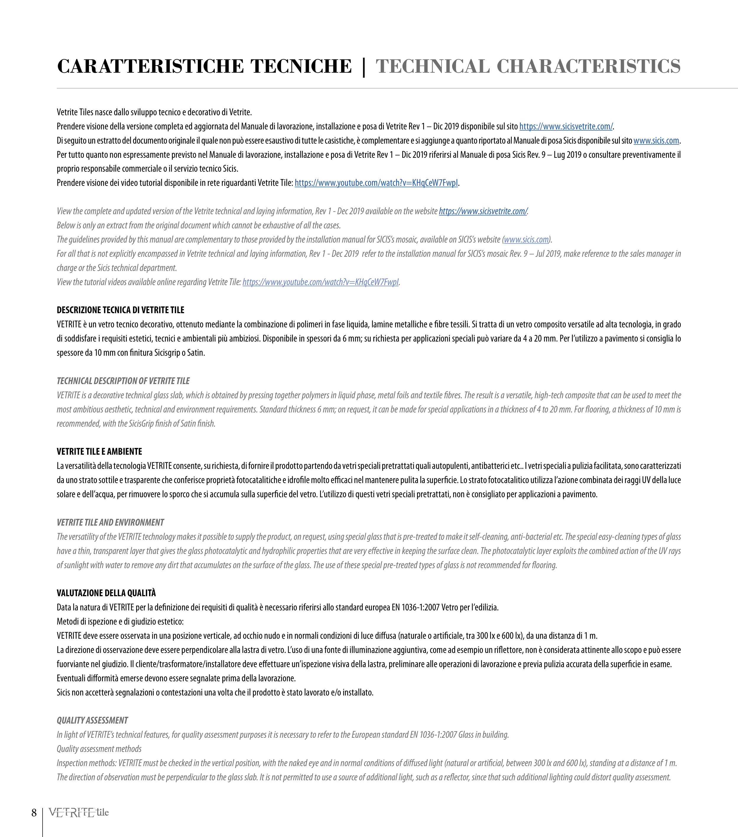 For all that is not explicitly encompassed in Vetrite technical and laying information, Rev 1 - Dec 2019 refer to the installation manual for SICIS’s mosaic Rev. 9 – Jul 2019, make reference to the sales manager in