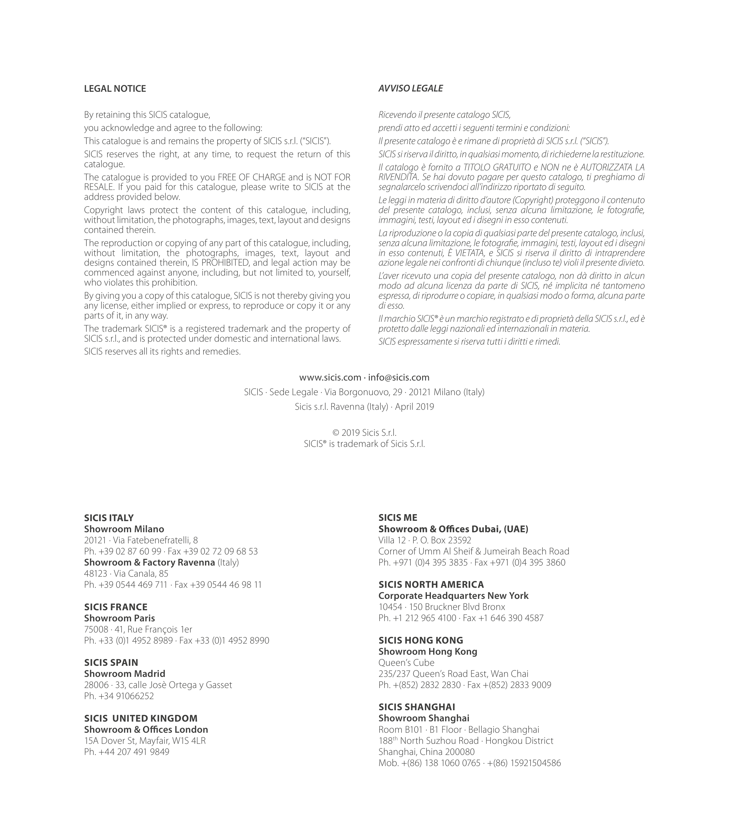 This catalogue is and remains the property of SICIS s.r.l. (“SICIS”).