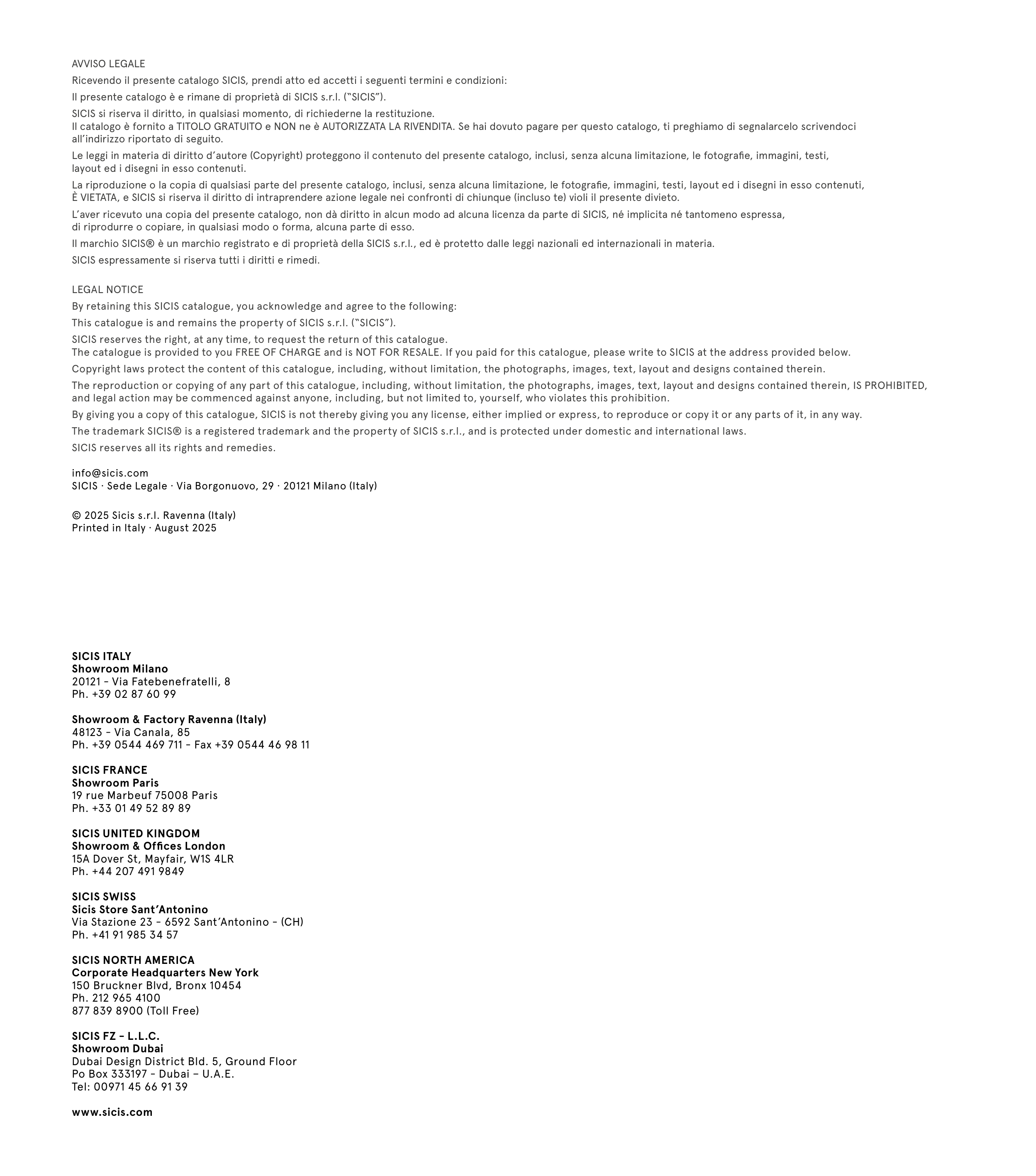This catalogue is and remains the property of SICIS s.r.l. (“SICIS”).