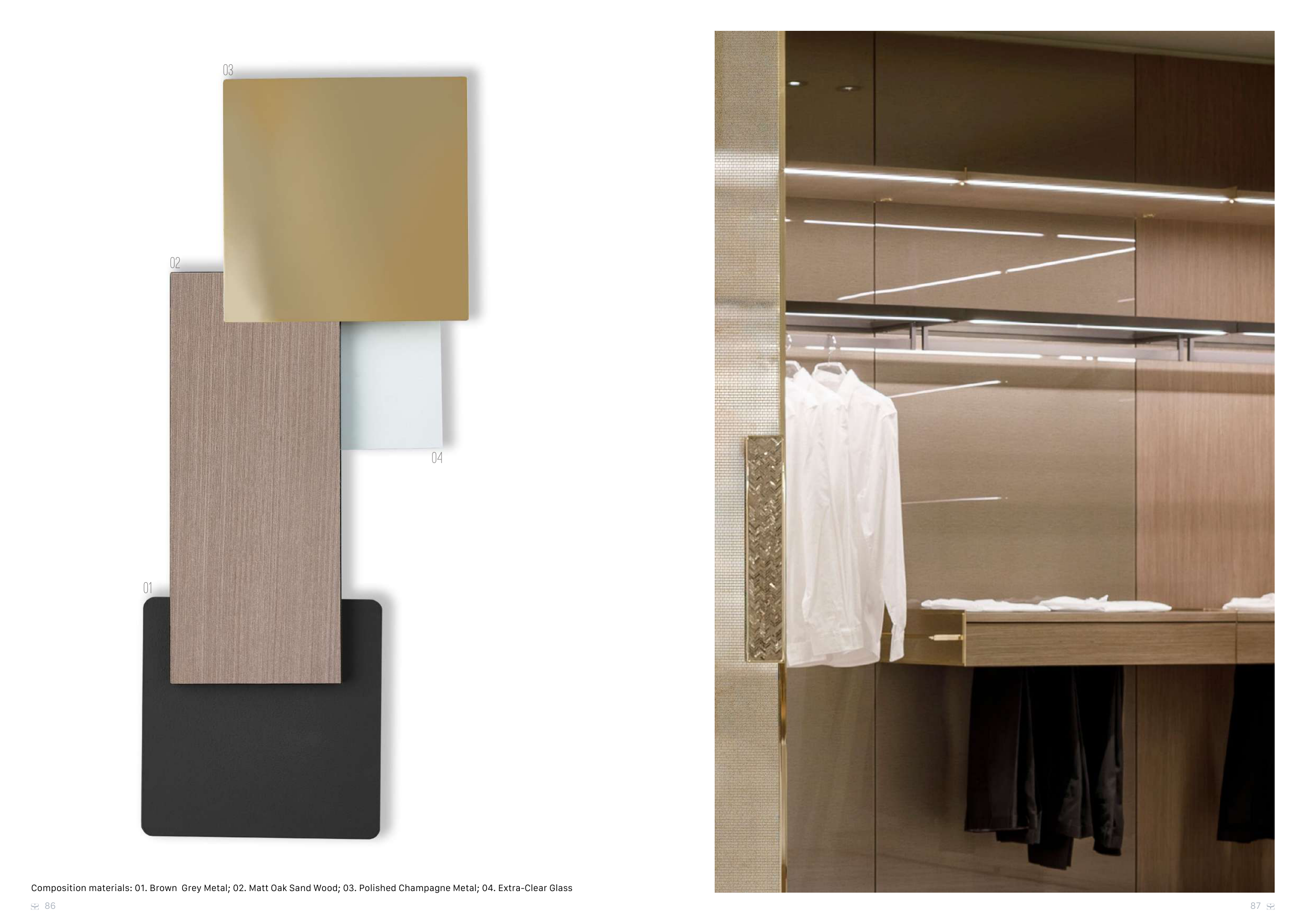 Composition materials: 01. Brown Grey Metal; 02. Matt Oak Sand Wood; 03. Polished Champagne Metal; 04. Extra-Clear Glass