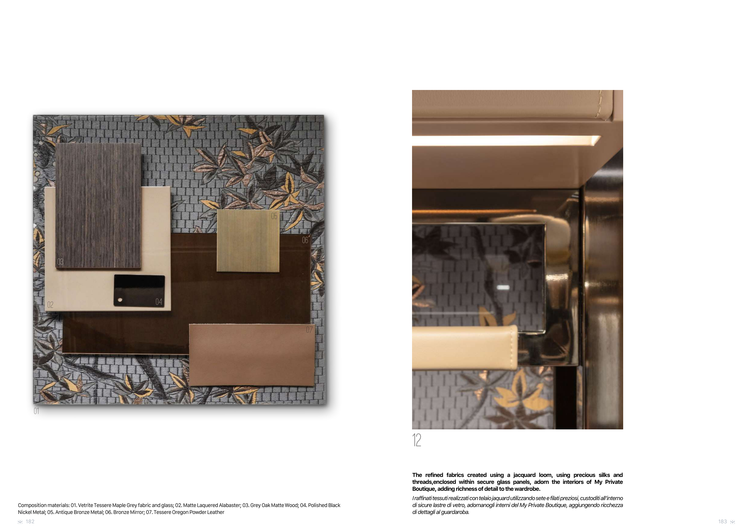 Composition materials: 01. Vetrite Tessere Maple Grey fabric and glass; 02. Matte Laquered Alabaster; 03. Grey Oak Matte Wood; 04. Polished Black