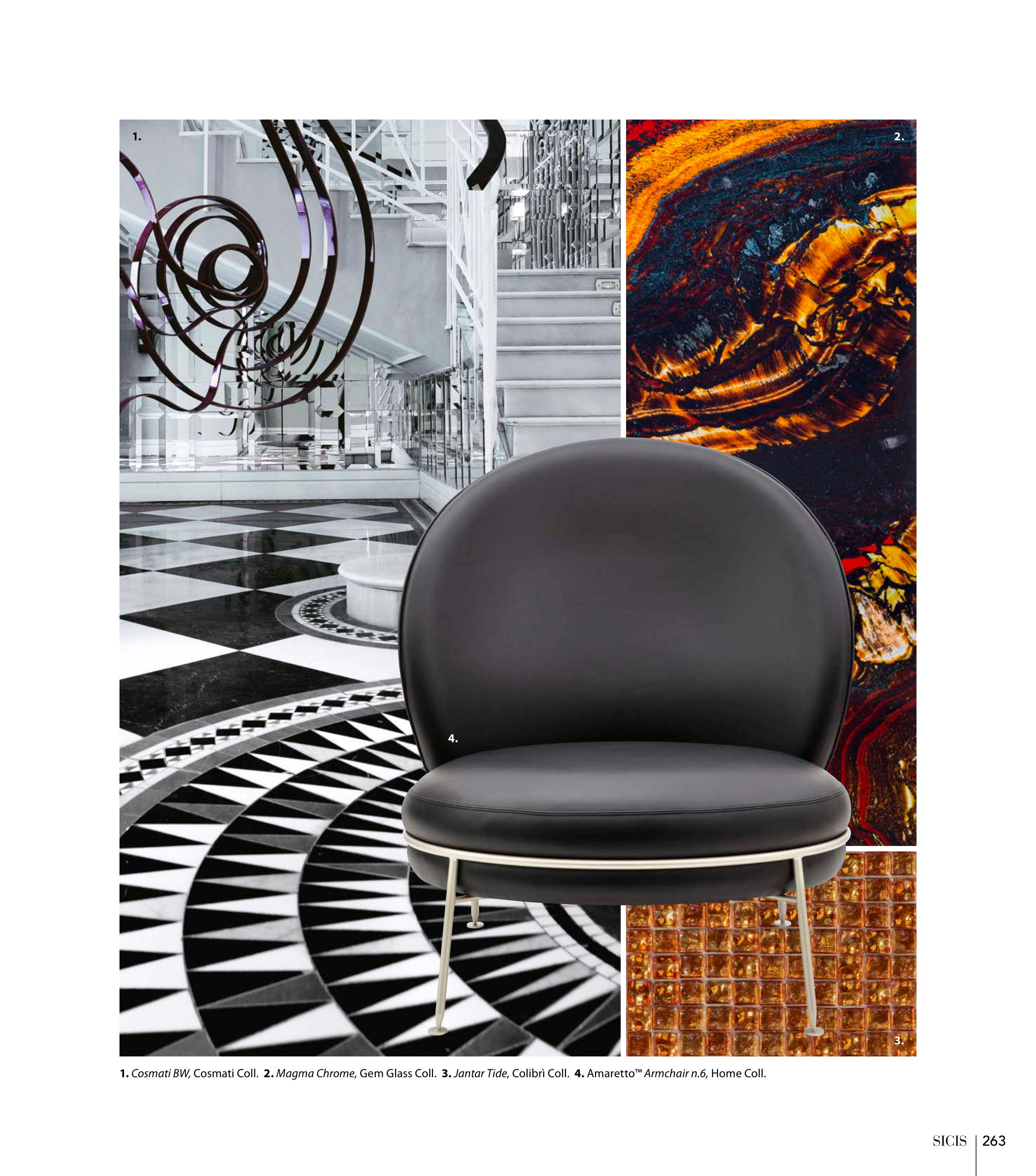 1. Cosmati BW, Cosmati Coll. 2. Magma Chrome, Gem Glass Coll. 3. Jantar Tide, Colibrì Coll. 4. Amaretto™ Armchair n.6, Home Coll.