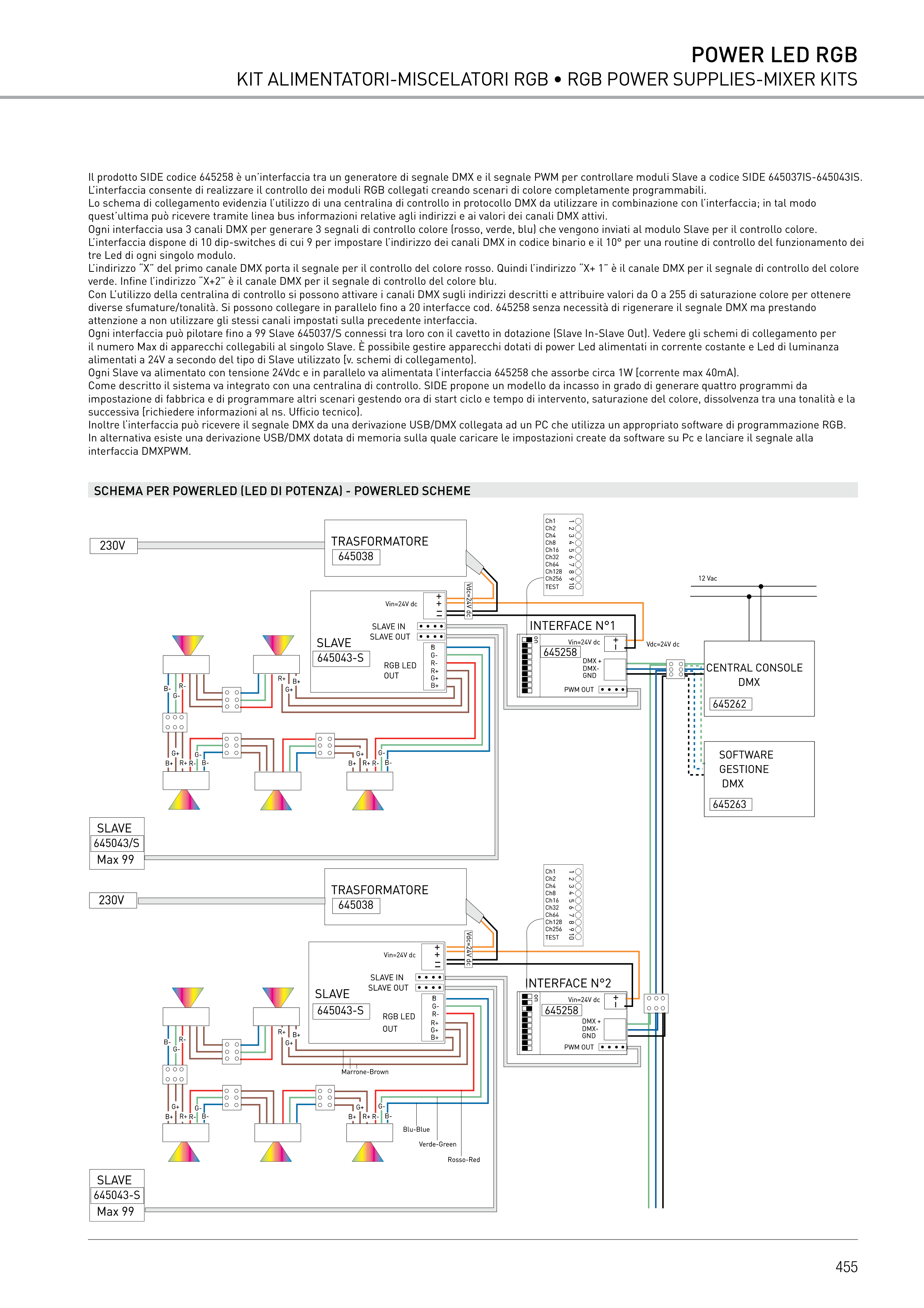 diverse sfumature/tonalità. Si possono collegare in parallelo fino a 20 interfacce cod. 645258 senza necessità di rigenerare il segnale DMX ma prestando
