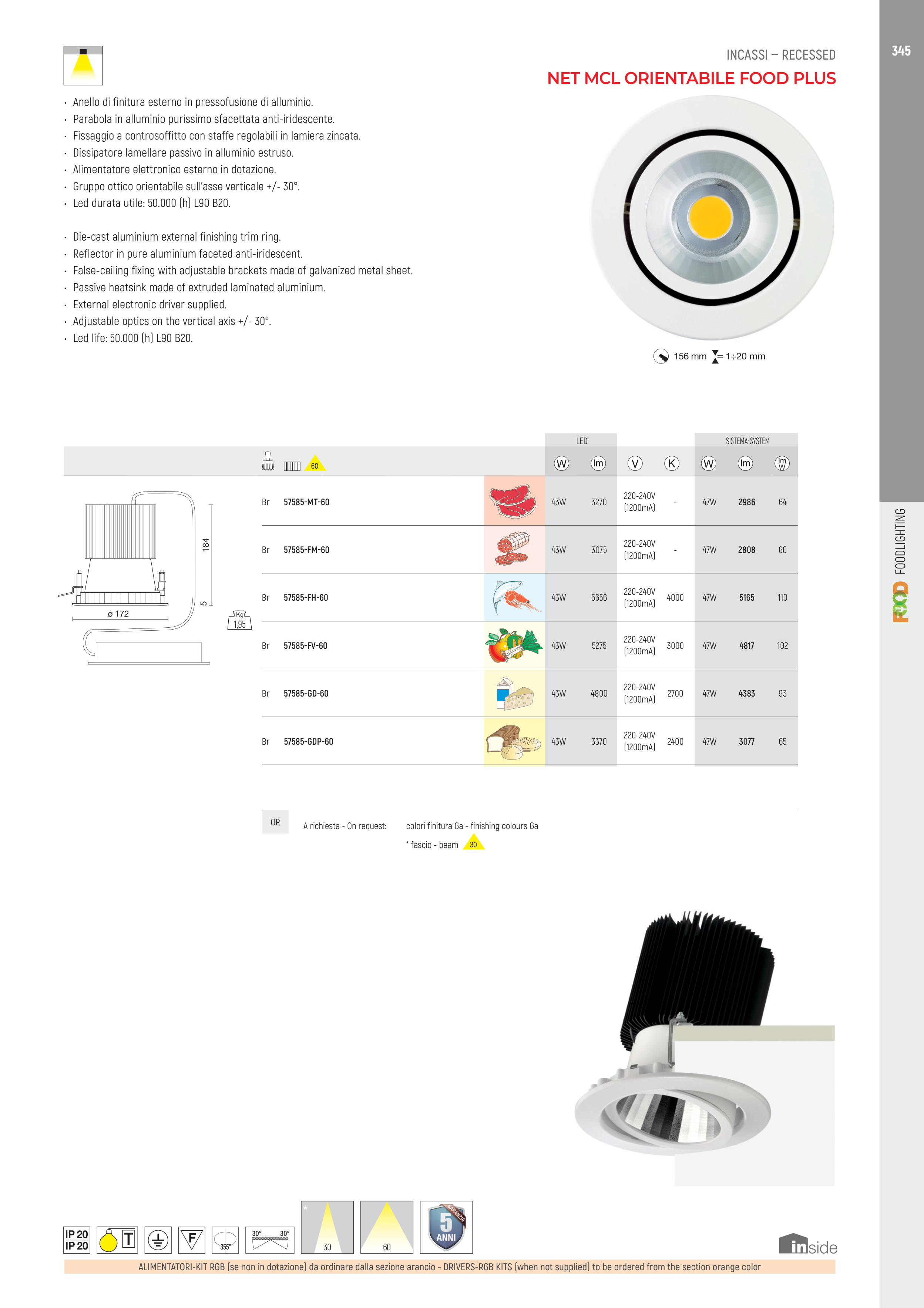 • Gruppo ottico orientabile sull’asse verticale +/- 30°.