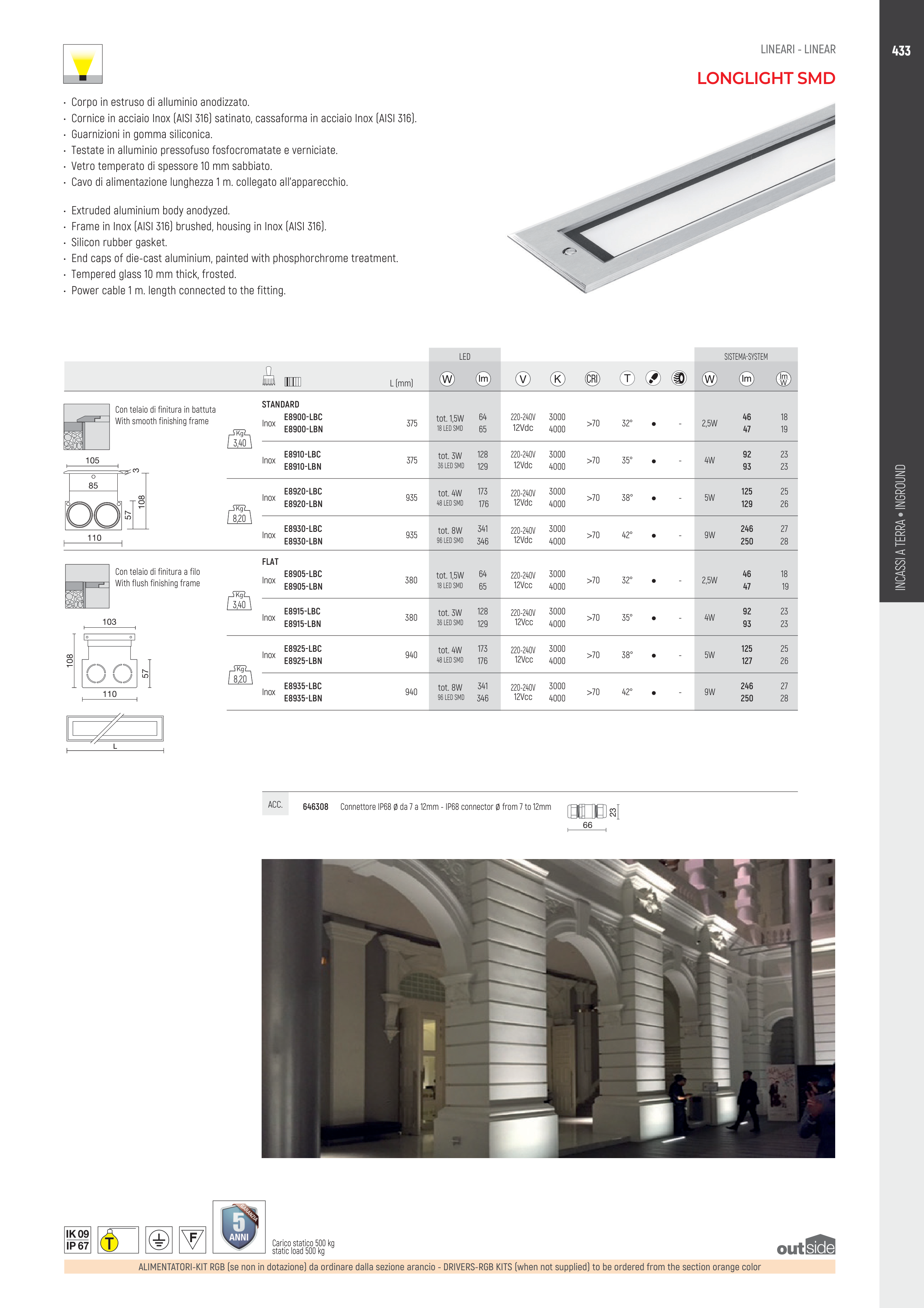 • Frame in Inox (AISI 316) brushed, housing in Inox (AISI 316).