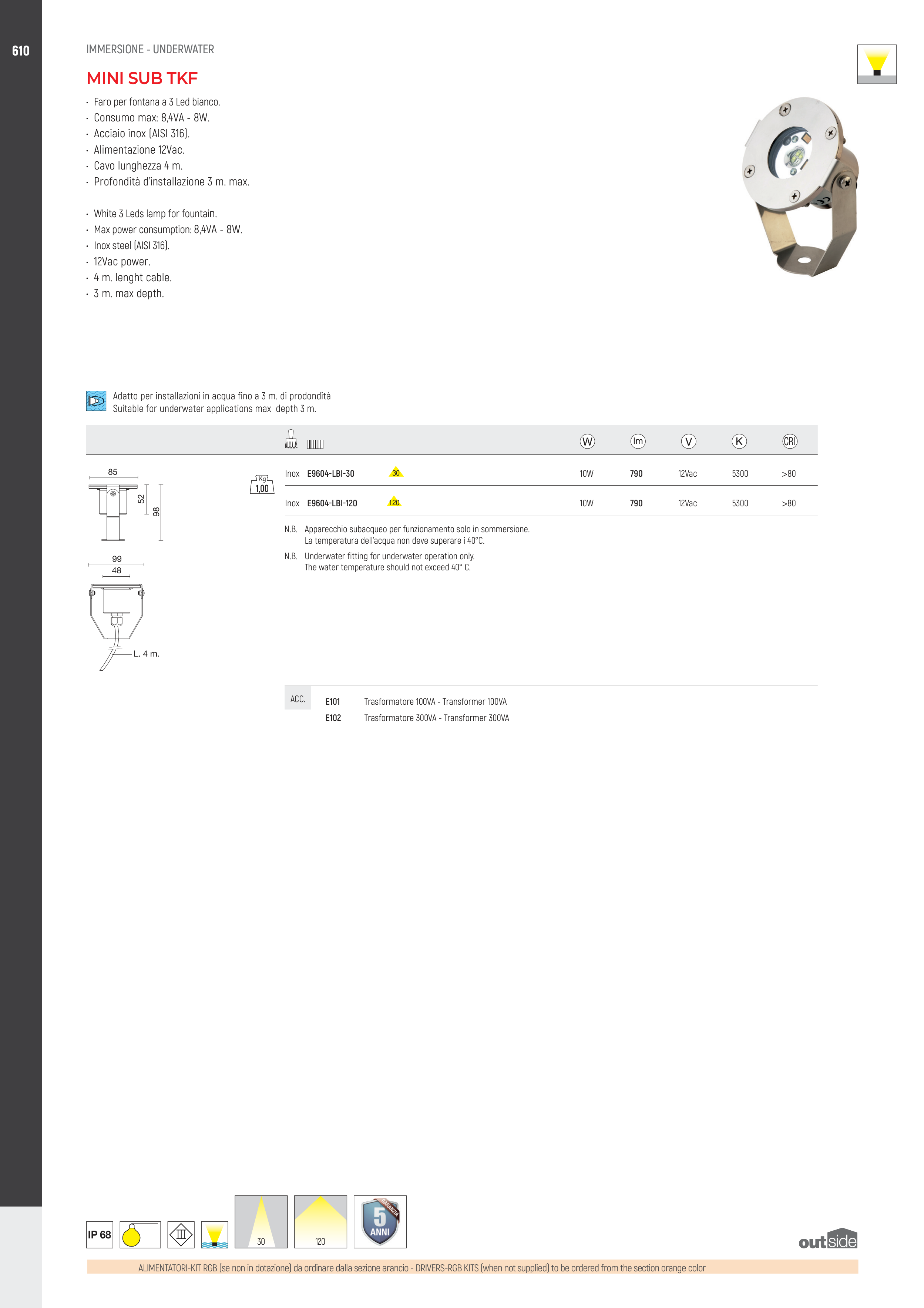 N.B. Apparecchio subacqueo per funzionamento solo in sommersione.