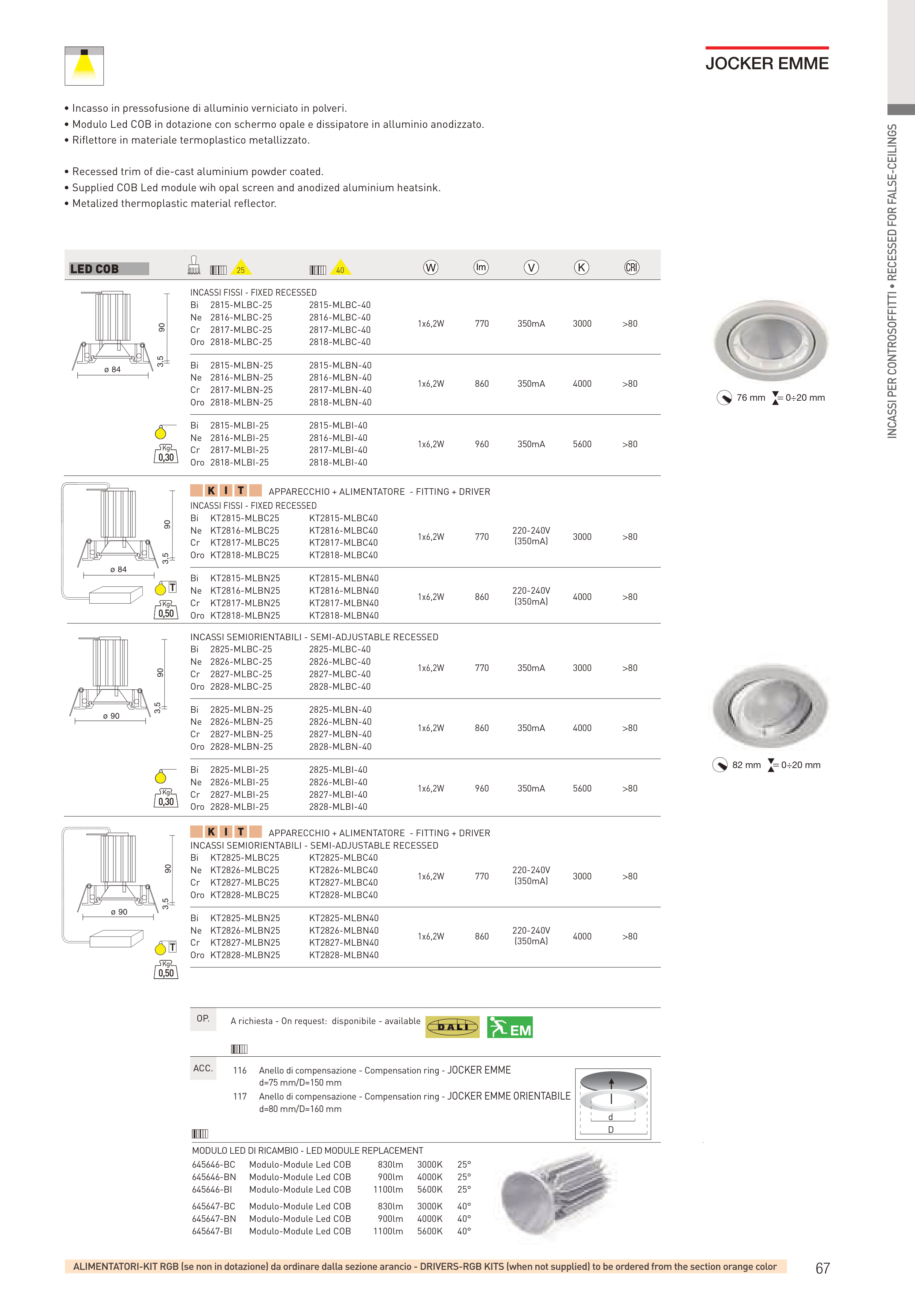 • Modulo Led COB in dotazione con schermo opale e dissipatore in alluminio anodizzato.