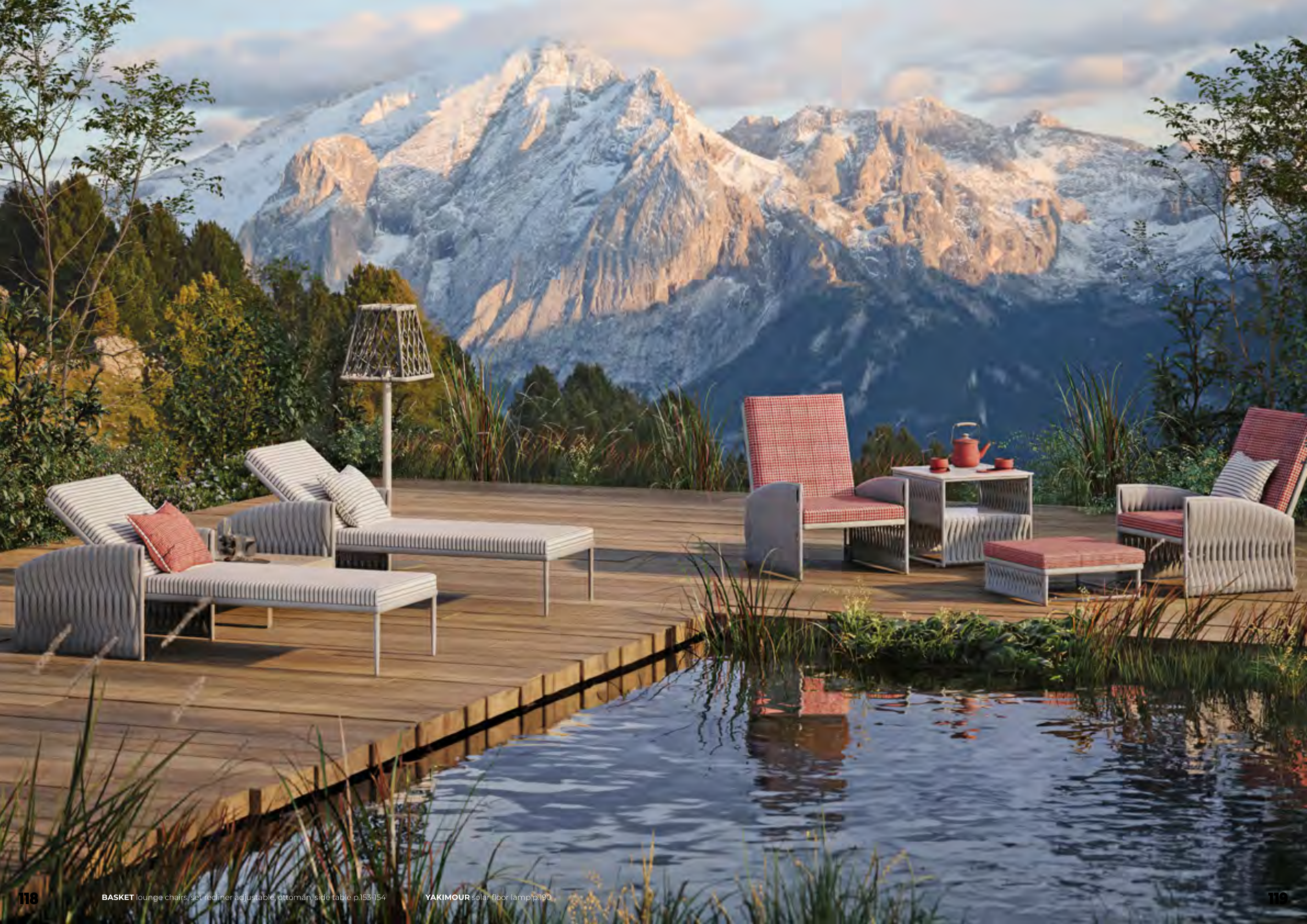BASKET lounge chairs, set recliner adjustable, ottoman, side table p.153-154 YAKIMOUR solar floor lamp p.190