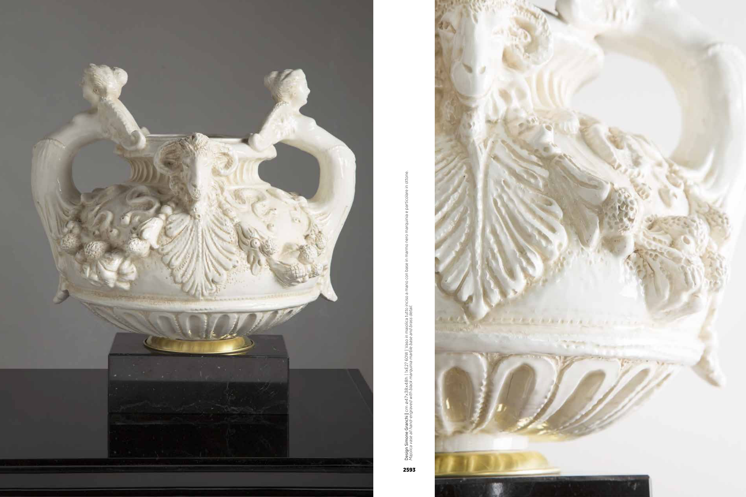 Design Simone Granchi | cm ø47x38x48h | 1xE27 60W | Vaso in maiolica tutto inciso a mano con base in marmo nero marquinia e particolare in ottone.