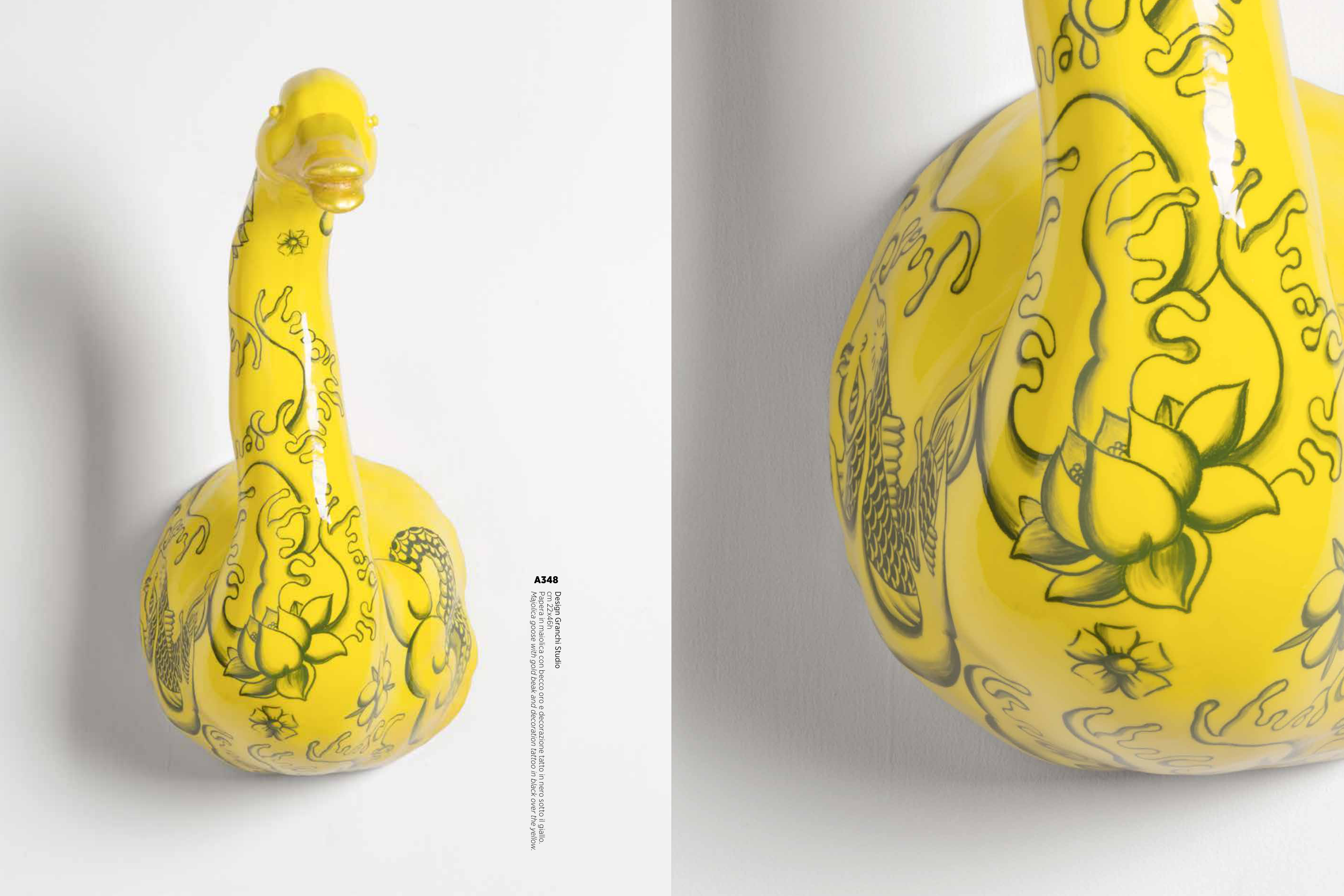 Majolica goose with gold beak and decoration tattoo in black over the yellow.