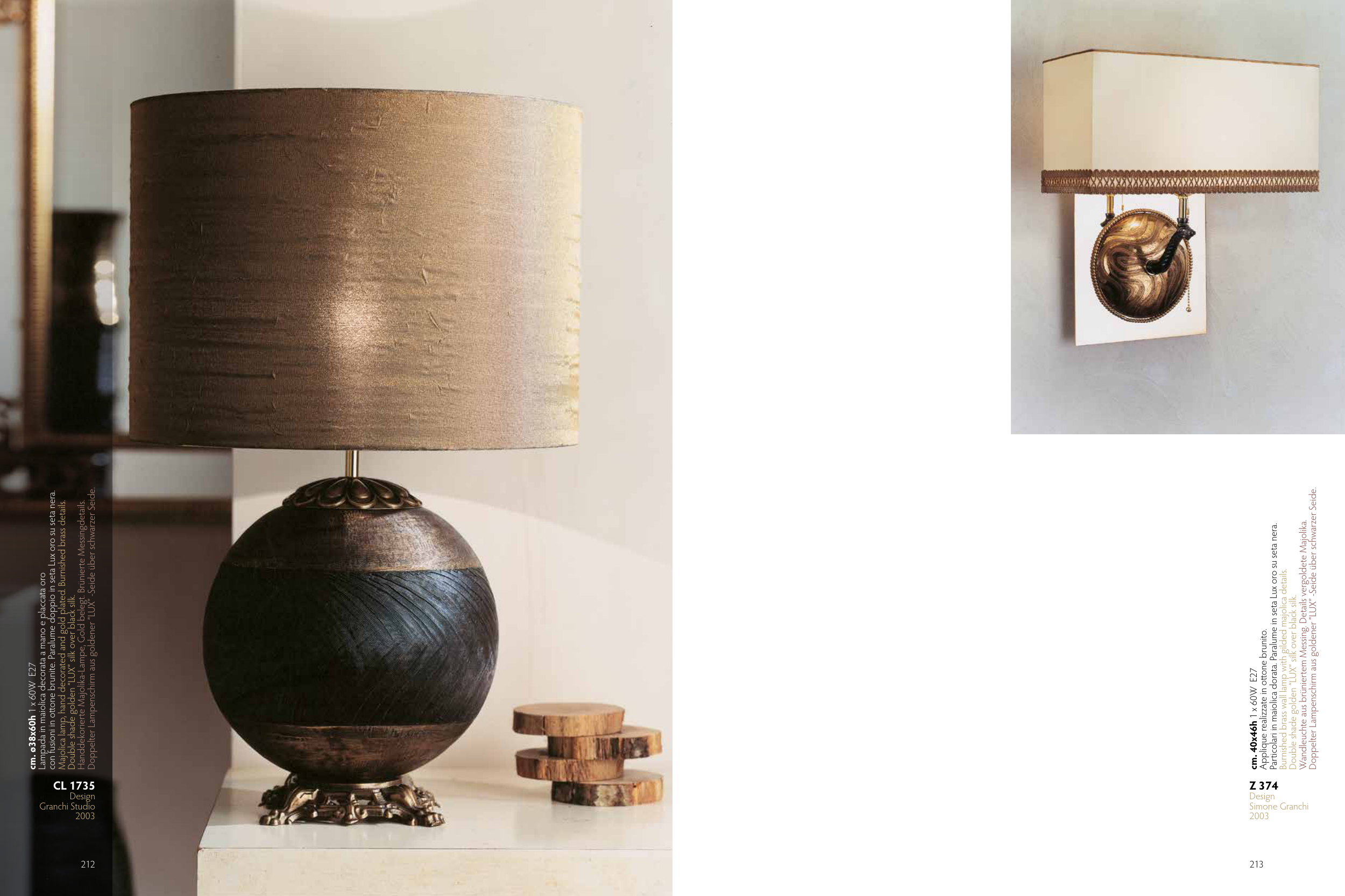 Particolari in maiolica dorata. Paralume in seta Lux oro su seta nera.