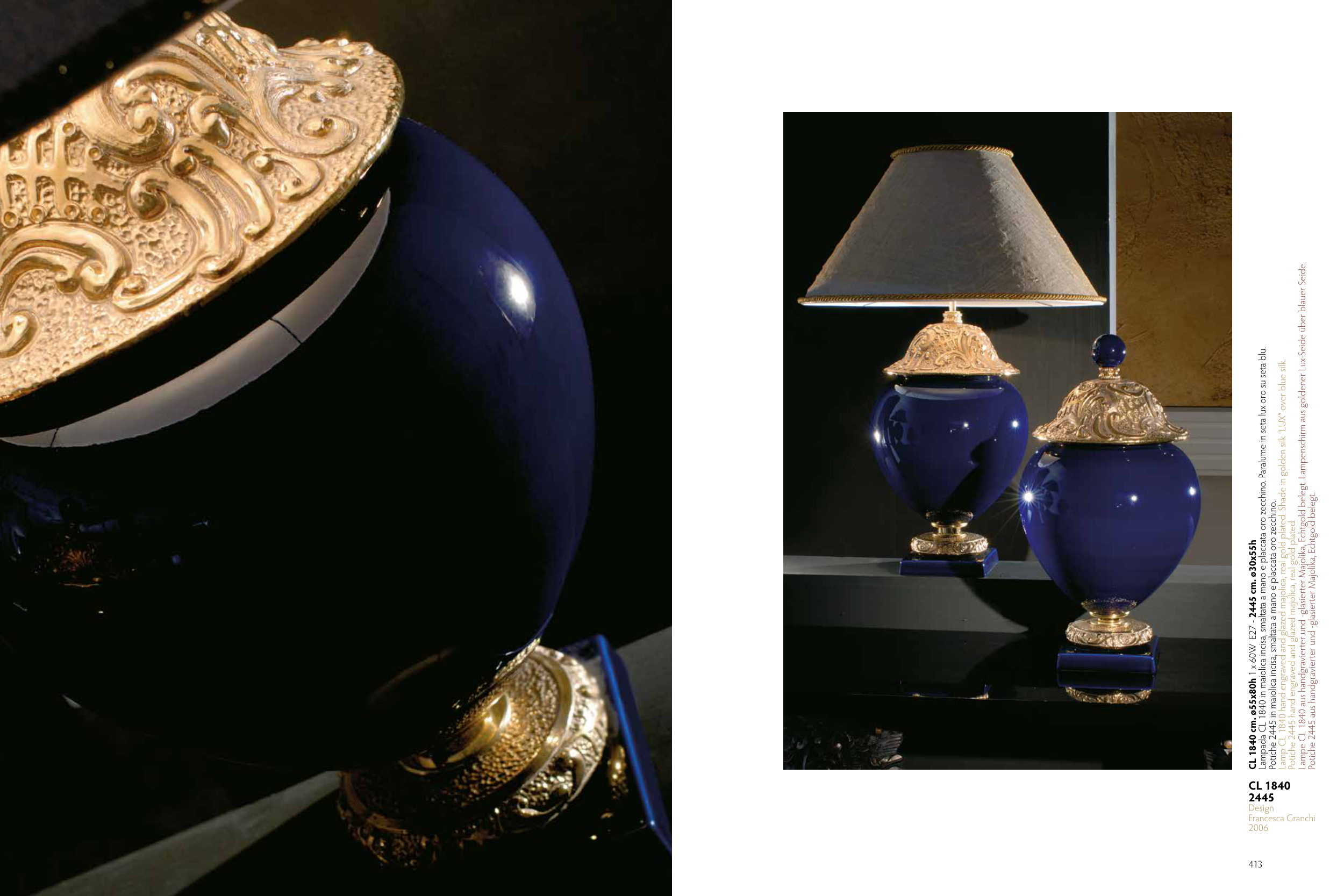 Lampada CL 1840 in maiolica incisa, smaltata a mano e placcata oro zecchino. Paralume in seta lux oro su seta blu.