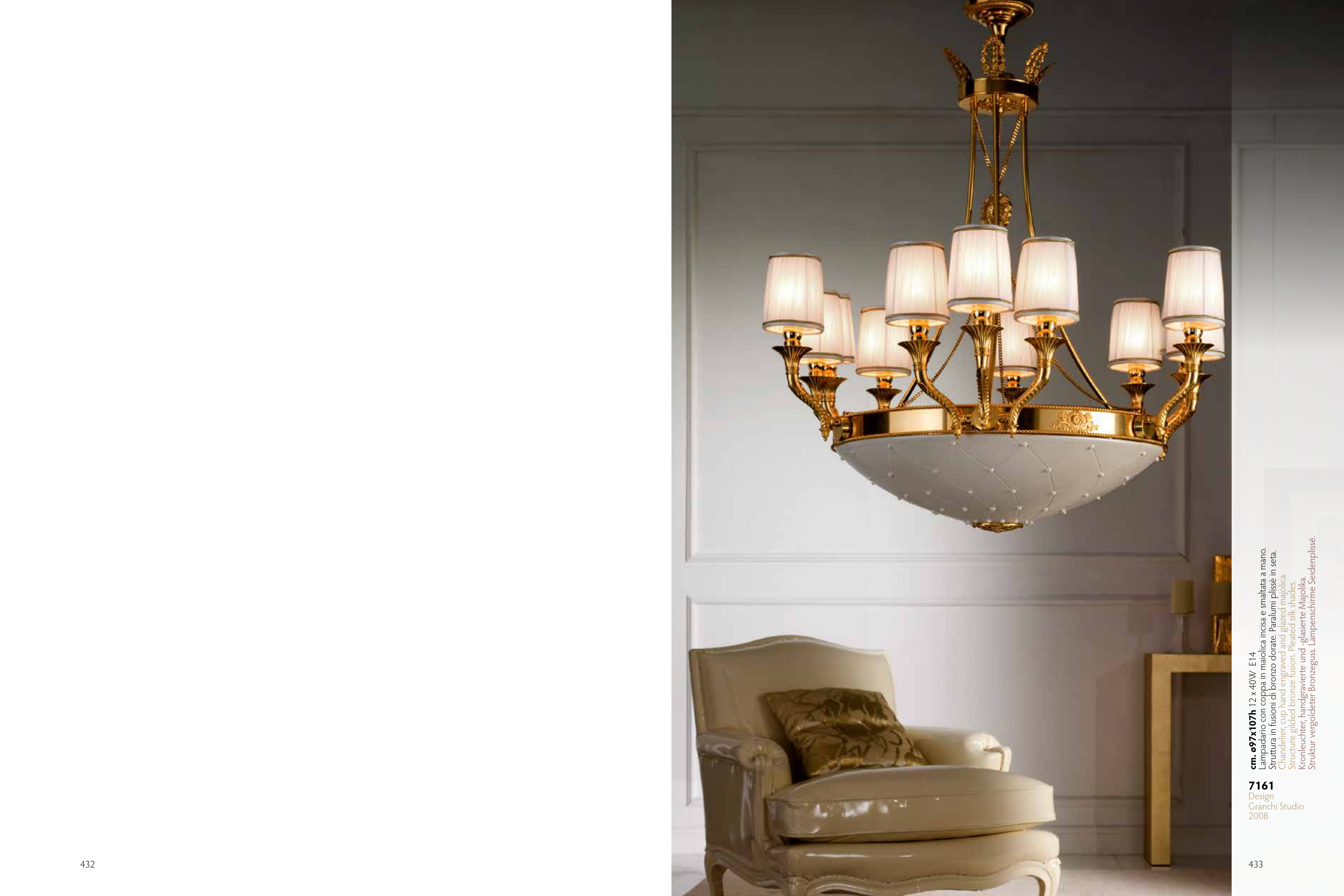 Struttura in fusioni di bronzo dorate. Paralumi plissè in seta.