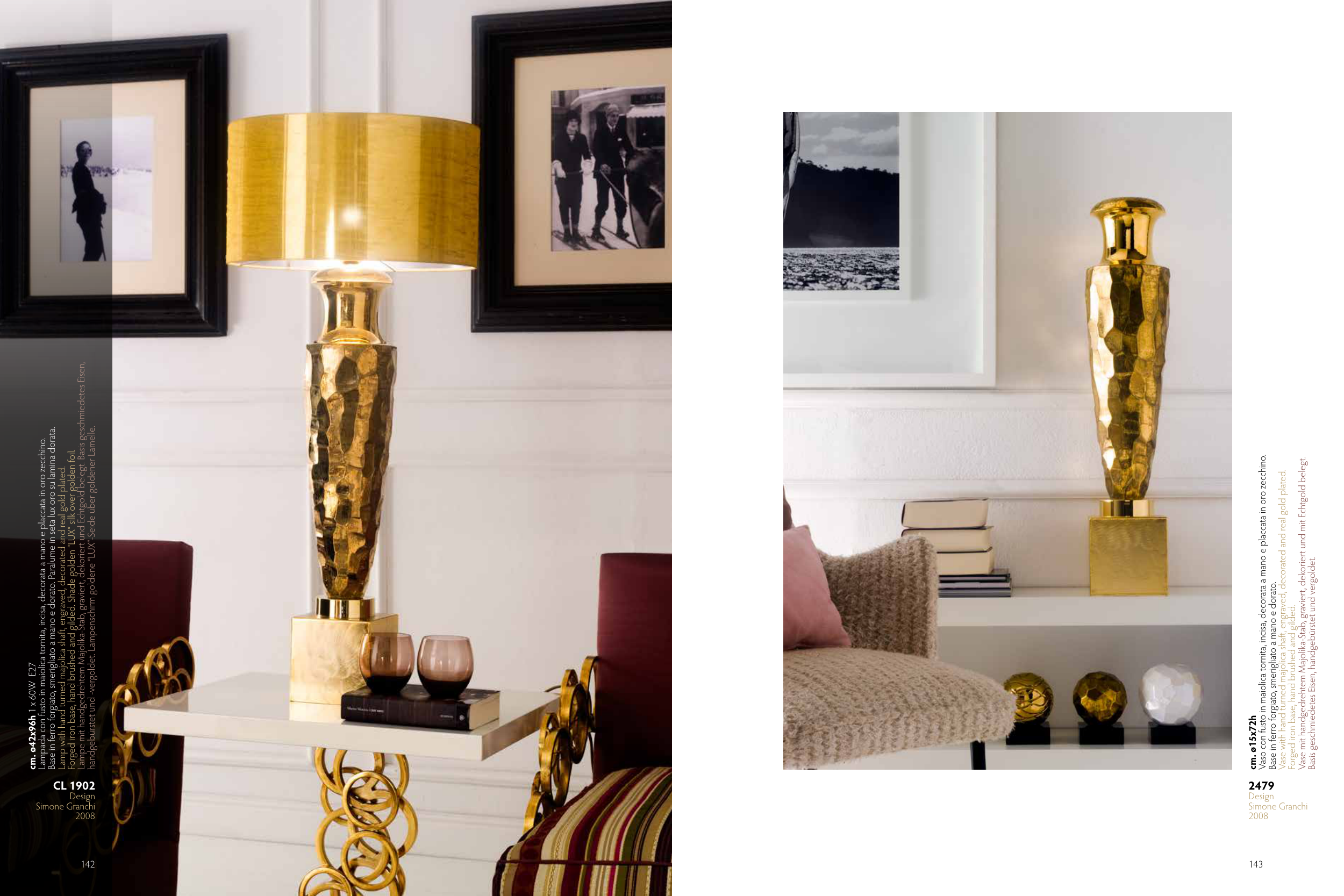 handgebürstet und -vergoldet. Lampenschirm goldene “LUX”-Seide über goldener Lamelle.