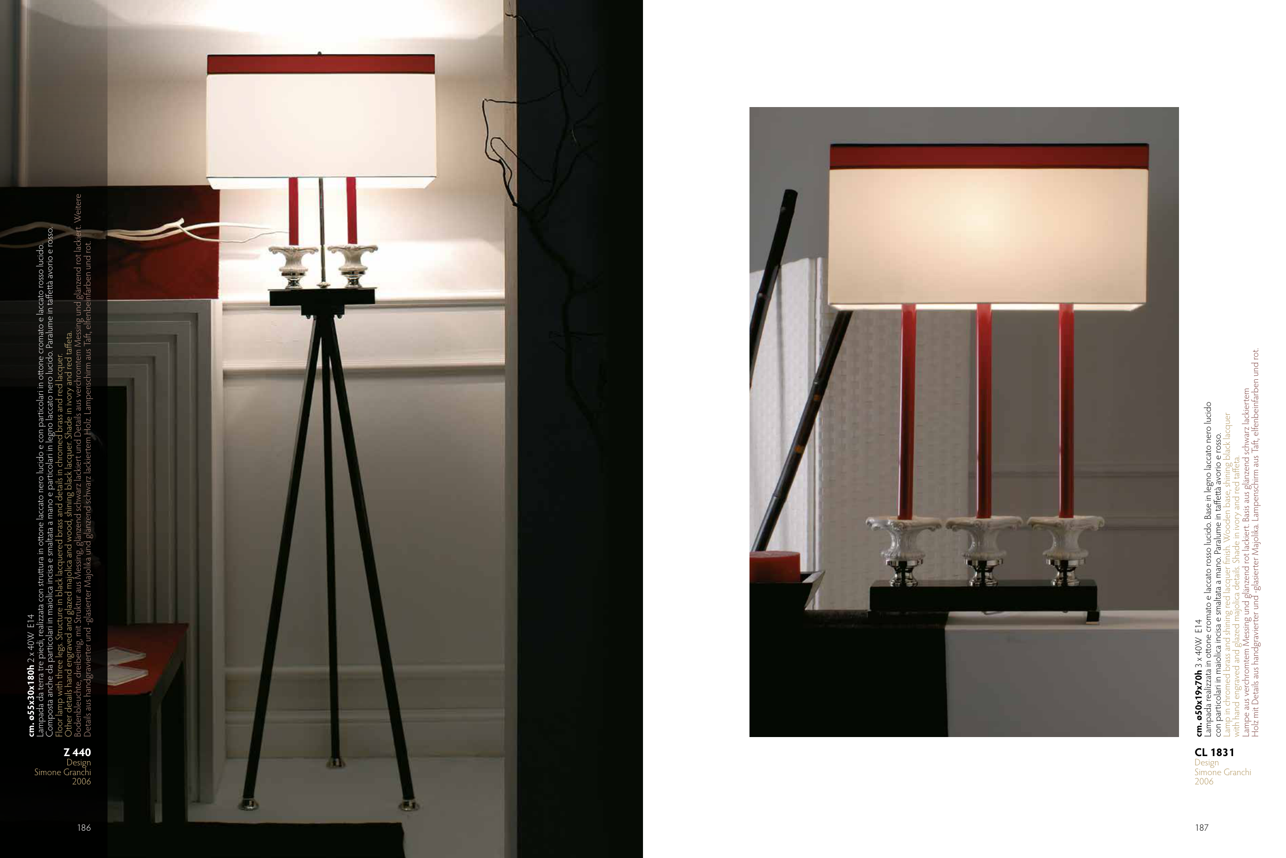 Composta anche da particolari in maiolica incisa e smaltata a mano e particolari in legno laccato nero lucido. Paralume in taffettà avorio e rosso.
