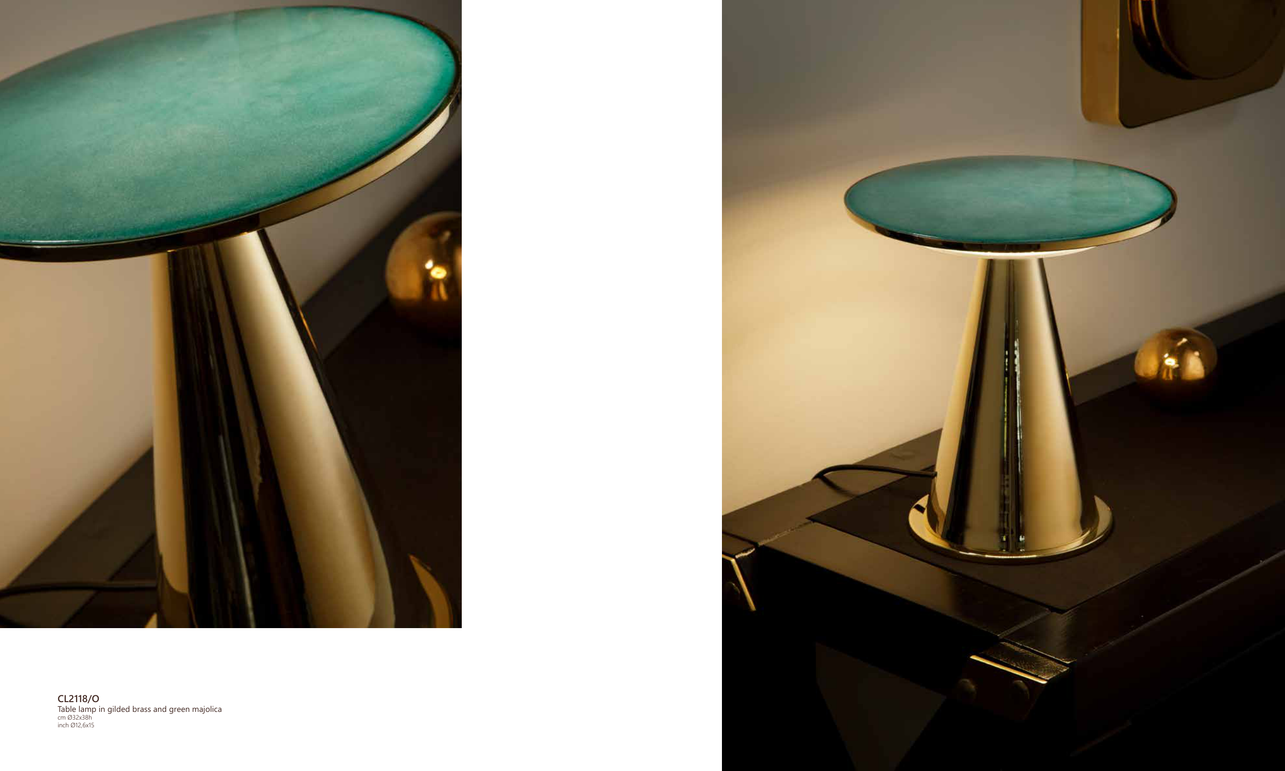Table lamp in gilded brass and green majolica