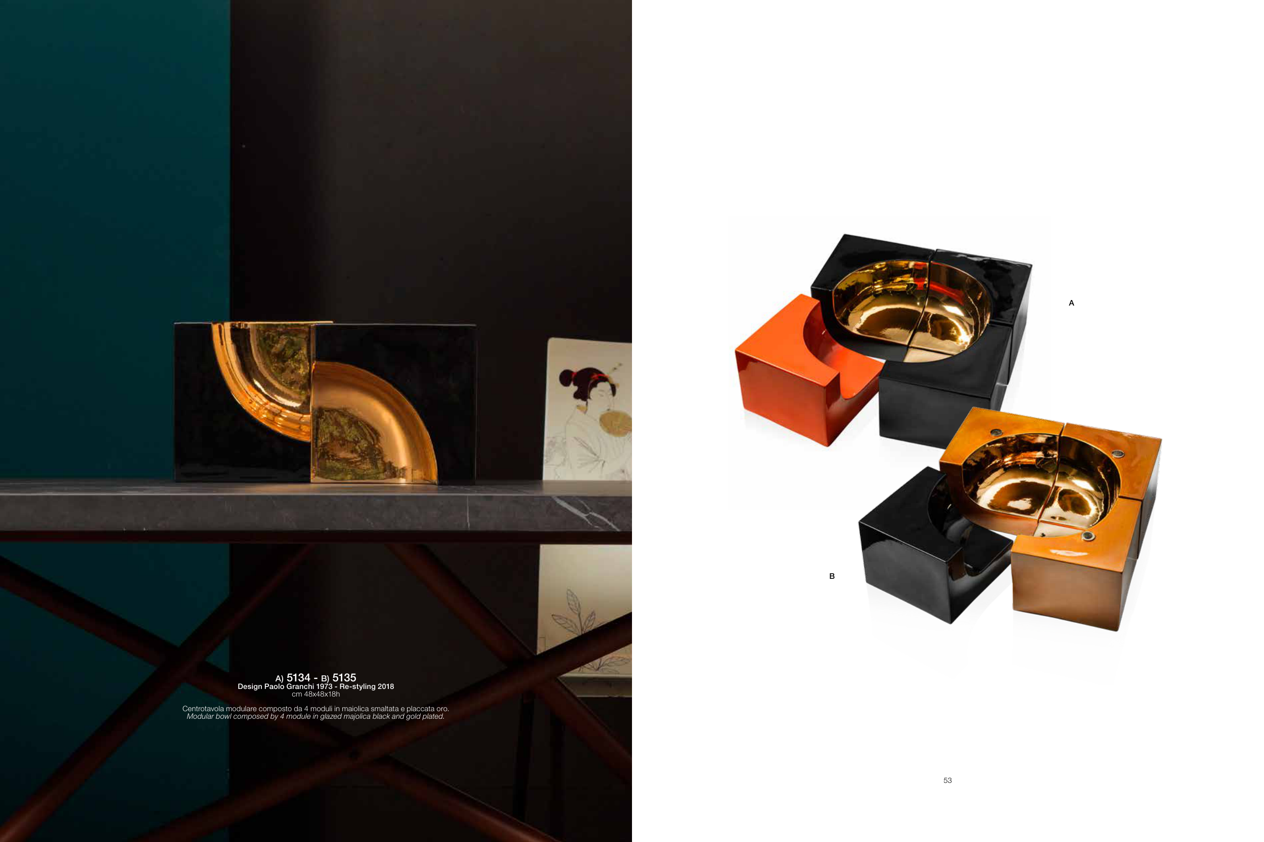 Centrotavola modulare composto da 4 moduli in maiolica smaltata e placcata oro.