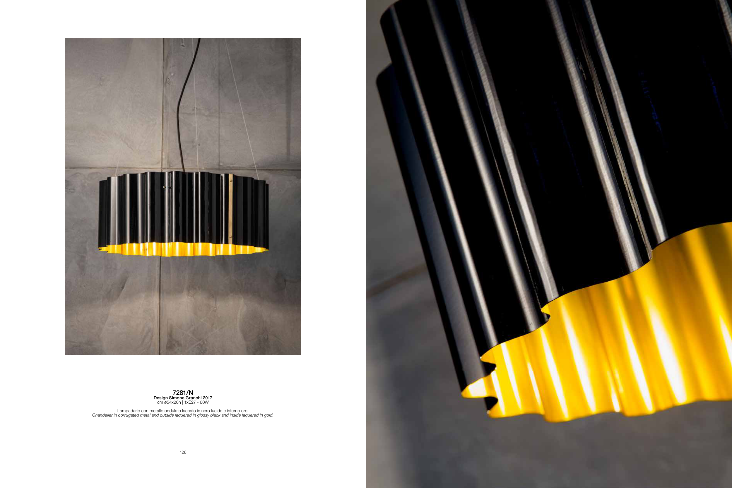Lampadario con metallo ondulato laccato in nero lucido e interno oro.