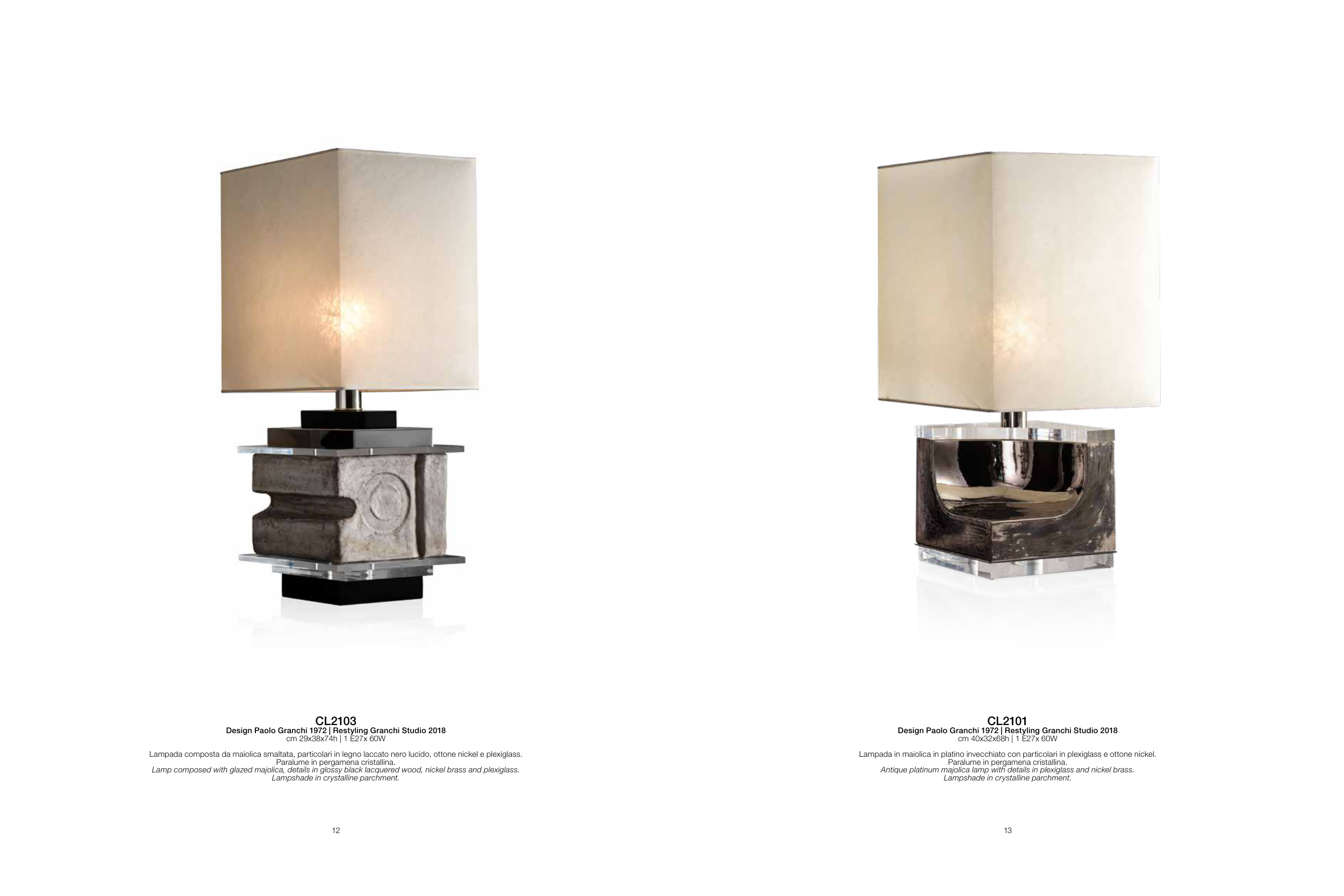Lampada in maiolica in platino invecchiato con particolari in plexiglass e ottone nickel.