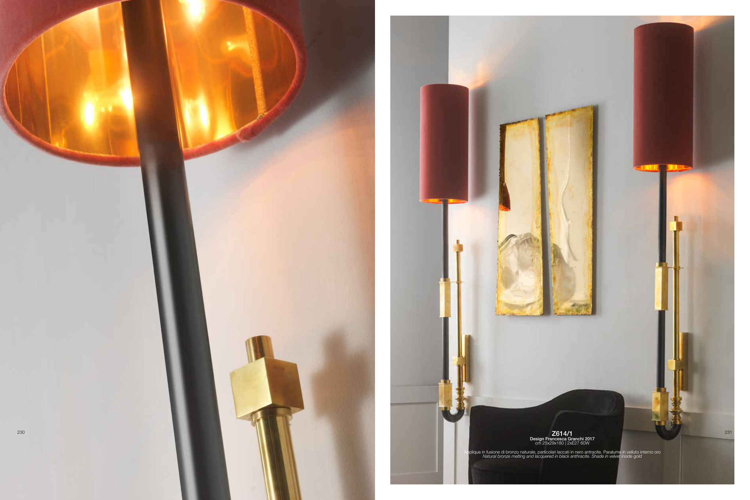 Applique in fusione di bronzo naturale, particolari laccati in nero antracite. Paralume in velluto interno oro